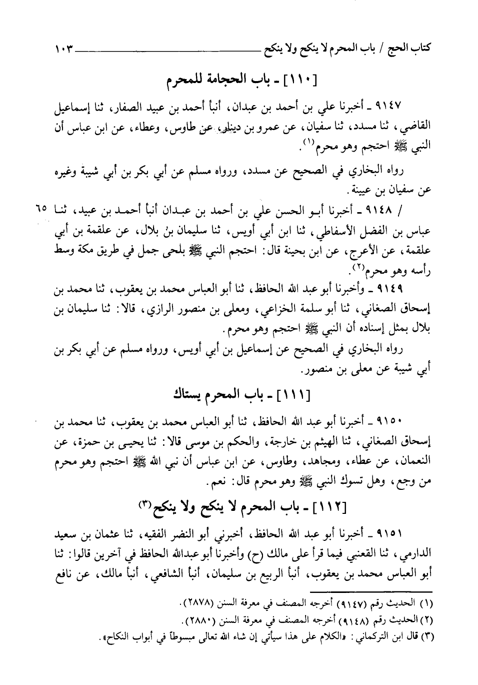 9147 - أَخْبَرَنَا عَلِيُّ بْنُ أَحْمَدَ بْنِ عَبْدَانَ , أنبأ أَحْمَدُ بْنُ عُبَيْدٍ الصَّفَّارُ , ثنا إِسْمَاعِيلُ الْقَاضِي , ثنا مُسَدَّدٌ , ثنا سُفْيَانُ , عَنْ عَمْرِو بْنِ دِينَارٍ , عَنْ طَاوُسٍ , وَعَطَاءٍ , عَنِ ابْنِ عَبَّاسٍ " أَنَّ النَّبِيَّ صَلَّى اللهُ عَلَيْهِ وَسَلَّمَ §احْتَجَمَ وَهُوَ مُحْرِمٌ " , رَوَاهُ الْبُخَارِيُّ فِي الصَّحِيحِ عَنْ مُسَدَّدٍ , وَرَوَاهُ مُسْلِمٌ عَنْ أَبِي بَكْرِ بْنِ أَبِي شَيْبَةَ وَغَيْرِهِ , عَنْ سُفْيَانَ بْنِ عُيَيْنَةَ