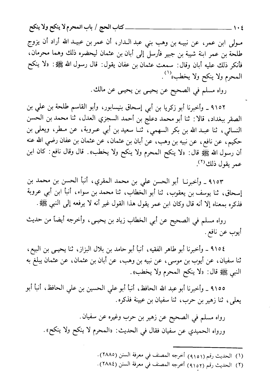 9152 - وَأَخْبَرَنَا أَبُو زَكَرِيَّا بْنُ أَبِي إِسْحَاقَ , بِنَيْسَابُورَ وَأَبُو الْقَاسِمِ طَلْحَةُ بْنُ عَلِيِّ بْنِ الصَّقْرِ بِبَغْدَادَ قَالَا: ثنا أَبُو مُحَمَّدٍ دَعْلَجُ بْنُ أَحْمَدَ السِّجْزِيُّ الْعَدْلُ , ثنا مُحَمَّدُ بْنُ الْحَسَنِ النَّسَائِيُّ , ثنا عَبْدُ اللهِ بْنُ بَكْرٍ السَّهْمِيُّ , ثنا سَعِيدُ بْنُ أَبِي عَرُوبَةَ , عَنْ مَطَرٍ , وَيَعْلَى بْنِ حَكِيمٍ , عَنْ نَافِعٍ , عَنْ نَبِيهِ بْنِ وَهْبٍ , عَنْ أَبَانَ بْنِ عُثْمَانَ , عَنْ عُثْمَانَ بْنِ عَفَّانَ رَضِيَ اللهُ عَنْهُ أَنَّ رَسُولَ اللهِ صَلَّى اللهُ عَلَيْهِ وَسَلَّمَ قَالَ: " §لَا يَنْكِحِ الْمُحْرِمُ وَلَا يُنْكِحْ وَلَا يَخْطُبْ " قَالَ: وَقَالَ نَافِعٌ: كَانَ ابْنُ عُمَرَ يَقُولُ ذَلِكَ