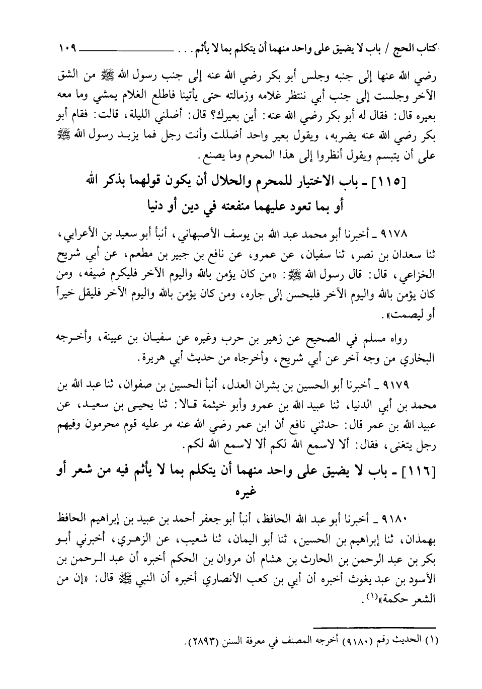 9180 - أَخْبَرَنَا أَبُو عَبْدِ اللهِ الْحَافِظُ , أنبأ أَبُو جَعْفَرٍ أَحْمَدُ بْنُ عُبَيْدِ بْنِ إِبْرَاهِيمَ الْحَافِظُ بِهَمْدَانَ , ثنا إِبْرَاهِيمُ بْنُ الْحُسَيْنِ , ثنا أَبُو الْيَمَانِ , ثنا شُعَيْبٌ , عَنِ الزُّهْرِيِّ , أَخْبَرَنِي أَبُو بَكْرِ بْنُ عَبْدِ الرَّحْمَنِ بْنِ الْحَارِثِ بْنِ هِشَامٍ أَنَّ مَرْوَانَ بْنَ الْحَكَمِ , أَخْبَرَهُ أَنَّ عَبْدَ الرَّحْمَنِ بْنَ الْأَسْوَدِ بْنِ عَبْدِ يَغُوثَ أَخْبَرَهُ أَنَّ أُبِيَّ بْنَ كَعْبٍ الْأَنْصَارِيَّ أَخْبَرَهُ أَنَّ النَّبِيَّ صَلَّى اللهُ عَلَيْهِ وَسَلَّمَ قَالَ: §" إِنَّ مِنَ الشِّعْرِ حِكْمَةً " -[110]- رَوَاهُ الْبُخَارِيُّ فِي الصَّحِيحِ , عَنْ أَبِي الْيَمَانِ