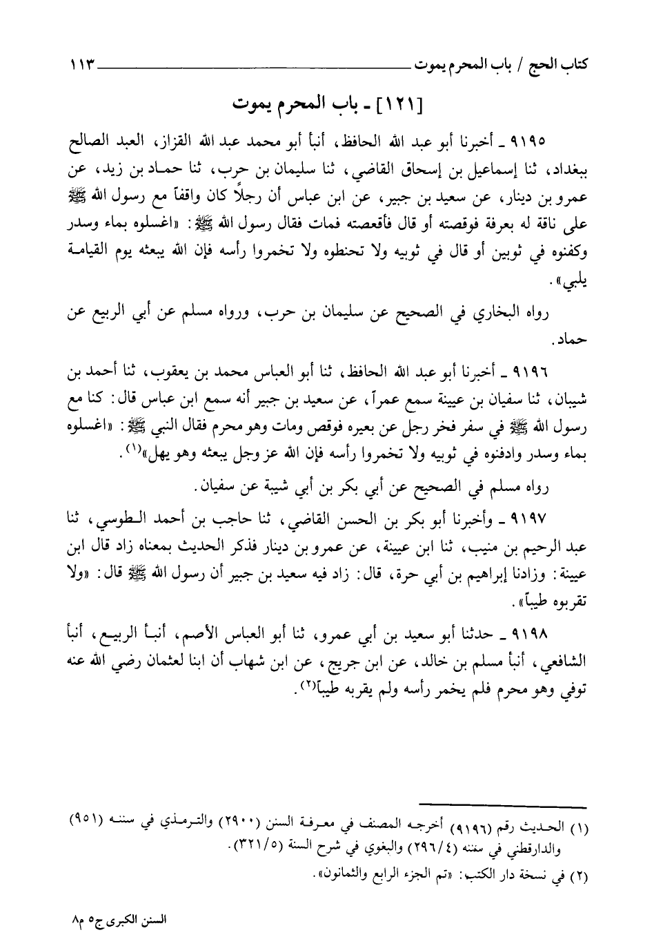 9195 - أَخْبَرَنَا أَبُو عَبْدِ اللهِ الْحَافِظُ , أنبأ أَبُو مُحَمَّدٍ عَبْدُ اللهِ الْقَزَّازُ الْعَبْدُ الصَّالِحُ , بِبَغْدَادَ , ثنا إِسْمَاعِيلُ بْنُ إِسْحَاقَ الْقَاضِي , ثنا سُلَيْمَانُ بْنُ حَرْبٍ , ثنا حَمَّادُ بْنُ زَيْدٍ عَنْ عَمْرِو بْنِ دِينَارٍ , عَنْ سَعِيدِ بْنِ جُبَيْرٍ , عَنِ ابْنِ عَبَّاسٍ أَنَّ رَجُلًا كَانَ وَاقِفًا مَعَ رَسُولِ اللهِ صَلَّى اللهُ عَلَيْهِ وَسَلَّمَ عَلَى نَاقَةٍ لَهُ بِعَرَفَةَ فَوَقَصَتْهُ أَوْ قَالَ: فَأَقْعَصَتْهُ فَمَاتَ , فَقَالَ رَسُولُ اللهِ صَلَّى اللهُ عَلَيْهِ وَسَلَّمَ: " §اغْسِلُوهُ بِمَاءٍ وَسِدْرٍ وَكَفِّنُوهُ فِي ثَوْبَيْنِ " أَوْ قَالَ: " فِي ثَوْبَيْهِ وَلَا تُحَنِّطُوهُ وَلَا تُخَمِّرُوا رَأْسَهُ؛ فَإِنَّ اللهَ يَبْعَثُهُ يَوْمَ الْقِيَامَةِ يُلَبِّي " رَوَاهُ الْبُخَارِيُّ فِي الصَّحِيحِ عَنْ سُلَيْمَانَ بْنِ حَرْبٍ , وَرَوَاهُ مُسْلِمٌ عَنْ أَبِي الرَّبِيعِ عَنْ حَمَّادٍ