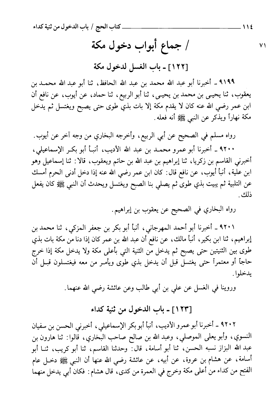 9200 - أَخْبَرَنَا أَبُو عَمْرٍو مُحَمَّدُ بْنُ عَبْدِ اللهِ الْأَدِيبُ , أنبأ أَبُو بَكْرٍ الْإِسْمَاعِيلِيُّ , أَخْبَرَنِي الْقَاسِمُ بْنُ زَكَرِيَّا , ثنا إِبْرَاهِيمُ بْنُ عَبْدِ اللهِ بْنِ حَاتِمٍ , وَيَعْقُوبُ قَالَا: ثنا إِسْمَاعِيلُ وَهُوَ ابْنُ عُلَيَّةَ , أنبأ أَيُّوبُ , عَنْ نَافِعٍ قَالَ: " كَانَ ابْنُ عُمَرَ رَضِيَ اللهُ عَنْهُ إِذَا دَخَلَ أَدْنَى الْحَرَمِ §أَمْسَكَ عَنِ التَّلْبِيَةِ , ثُمَّ يَبِيتُ بِذِي طُوًى , ثُمَّ يُصَلِّي بِنَا الصُّبْحَ , وَيَغْتَسِلُ وَيُحَدِّثُ أَنَّ النَّبِيَّ صَلَّى اللهُ عَلَيْهِ وَسَلَّمَ كَانَ يَفْعَلُ ذَلِكَ " رَوَاهُ الْبُخَارِيُّ فِي الصَّحِيحِ عَنْ يَعْقُوبَ بْنِ إِبْرَاهِيمَ