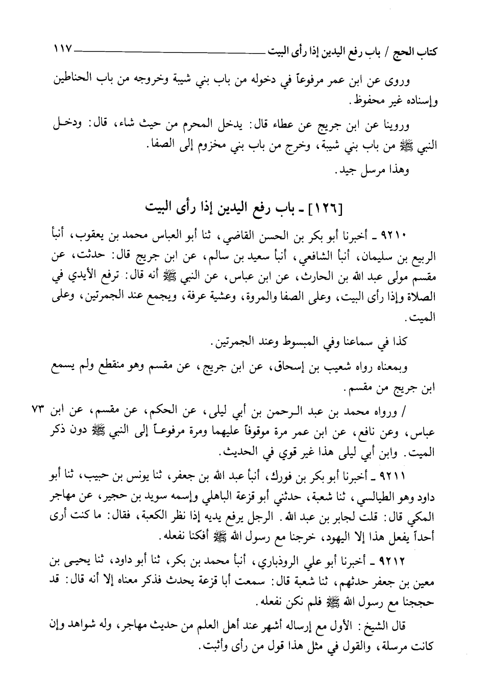 9210 - أَخْبَرَنَا أَبُو بَكْرِ بْنُ الْحَسَنِ الْقَاضِي , ثنا أَبُو الْعَبَّاسِ مُحَمَّدُ بْنُ يَعْقُوبَ , أنبأ الرَّبِيعُ بْنُ سُلَيْمَانَ , أنبأ الشَّافِعِيُّ , أنبأ سَعِيدُ بْنُ سَالِمٍ , عَنِ ابْنِ جُرَيْجٍ , قَالَ: حُدِّثْتُ , عَنْ مِقْسَمٍ مَوْلَى عَبْدِ اللهِ بْنِ الْحَارِثِ , عَنِ ابْنِ عَبَّاسٍ , عَنِ النَّبِيِّ صَلَّى اللهُ عَلَيْهِ وَسَلَّمَ أَنَّهُ قَالَ: §" تُرْفَعُ الْأَيْدِي فِي الصَّلَاةِ , وَإِذَا رَأَى الْبَيْتَ , وَعَلَى الصَّفَا وَالْمَرْوَةِ وَعَشِيَّةَ عَرَفَةَ وَبِجَمْعٍ عِنْدَ الْجَمْرَتَيْنِ وَعَلَى الْمَيِّتِ " كَذَا فِي سَمَاعِنَا وَفِي الْمَبْسُوطِ " وَعِنْدَ الْجَمْرَتَيْنِ " , وَبِمَعْنَاهُ رَوَاهُ شُعَيْبُ بْنُ إِسْحَاقَ عَنِ ابْنِ جُرَيْجٍ , عَنْ مِقْسَمٍ وَهُوَ مُنْقَطِعٌ َلَمْ يَسْمَعه ابْنُ جُرَيْجٍ مِنْ مِقْسَمٍ , وَرَوَاهُ مُحَمَّدُ بْنُ عَبْدِ الرَّحْمَنِ بْنِ أَبِي لَيْلَى عَنِ الْحَكَمِ عَنْ مِقْسَمٍ , عَنِ ابْنِ عَبَّاسٍ , وَعَنْ نَافِعٍ , عَنِ ابْنِ عُمَرَ مَرَّةً مَوْقُوفًا عَلَيْهِمَا , وَمَرَّةً مَرْفُوعًا إِلَى النَّبِيِّ صَلَّى اللهُ عَلَيْهِ وَسَلَّمَ دُونَ ذِكْرِ الْمَيِّتِ وَابْنُ أَبِي لَيْلَى هَذَا غَيْرُ قَوِيٍّ فِي الْحَدِيثِ