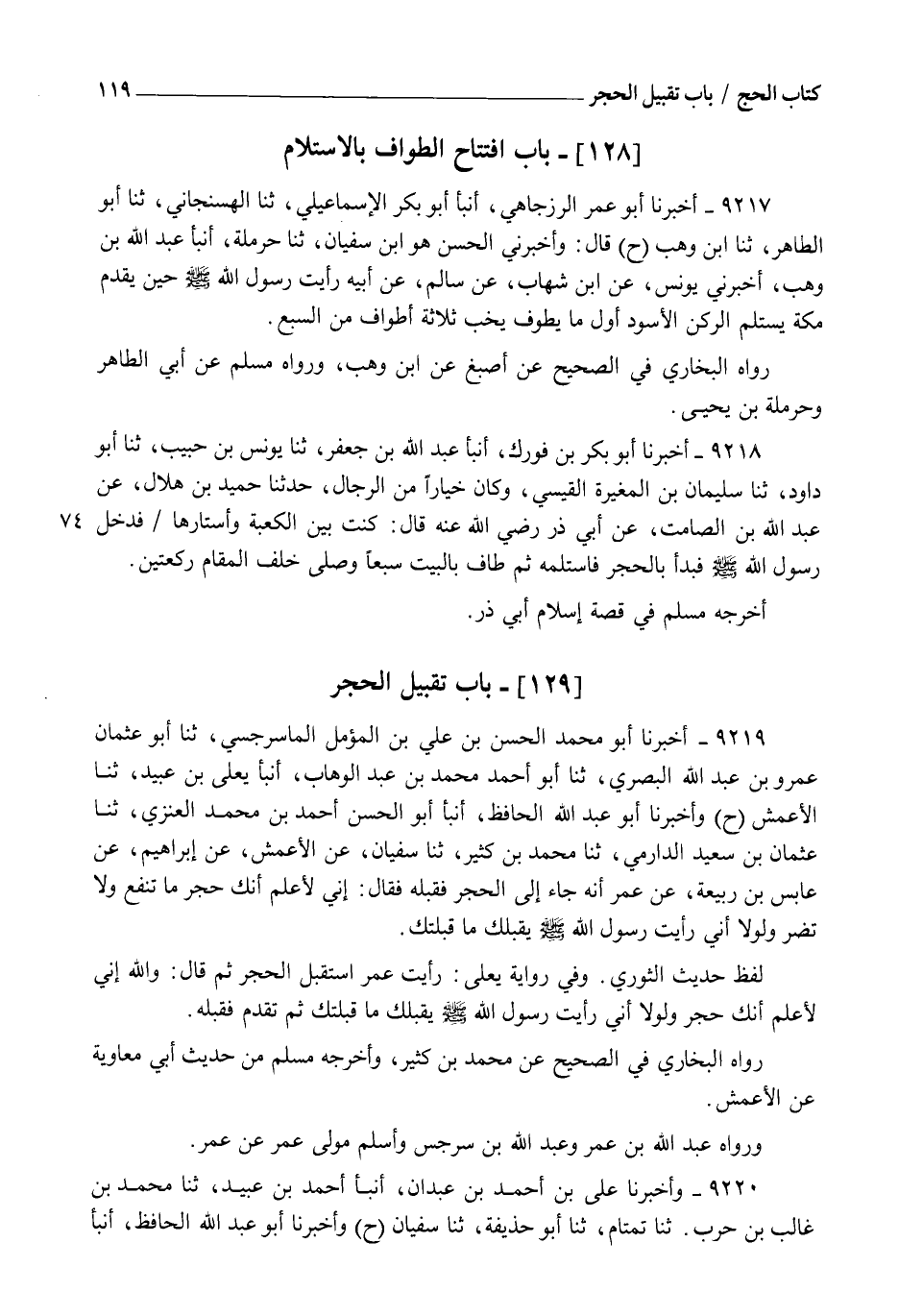 9217 - أَخْبَرَنَا أَبُو عُمَرَ الرَّزْجَاهِيُّ , أنبأ أَبُو بَكْرٍ الْإِسْمَاعِيلِيُّ , ثنا الْهِسِنْجَانِيُّ , ثنا أَبُو الطَّاهِرِ , ثنا ابْنُ وَهْبٍ , ح قَالَ: وَأَخْبَرَنِي الْحَسَنُ هُوَ ابْنُ سُفْيَانَ , ثنا حَرْمَلَةُ , أنبأ عَبْدُ اللهِ بْنُ وَهْبٍ , أَخْبَرَنِي يُونُسُ , عَنِ ابْنِ شِهَابٍ , عَنْ سَالِمٍ , عَنْ أَبِيهِ " رَأَيْتُ رَسُولَ اللهِ صَلَّى اللهُ عَلَيْهِ وَسَلَّمَ حِينَ يَقْدَمُ مَكَّةَ §يَسْتَلِمُ الرُّكْنَ الْأَسْوَدَ أَوَّلَ مَا يَطُوفُ يَخُبُّ ثَلَاثَةَ أَطْوَافٍ مِنَ السَّبْعِ " , رَوَاهُ الْبُخَارِيُّ فِي الصَّحِيحِ عَنْ أَصْبَغَ , عَنِ ابْنِ وَهْبٍ , وَرَوَاهُ مُسْلِمٌ عَنْ أَبِي الطَّاهِرِ وَحَرْمَلَةَ بْنِ يَحْيَى