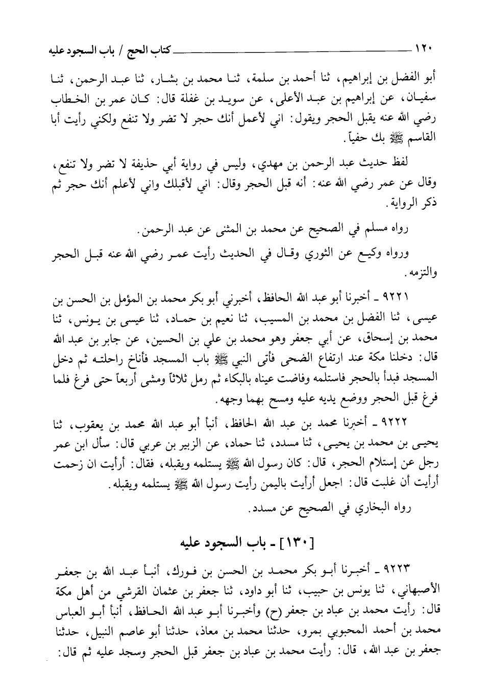 9223 - أَخْبَرَنَا أَبُو بَكْرٍ مُحَمَّدُ بْنُ الْحَسَنِ بْنِ فُورَكٍ , أنبأ عَبْدُ اللهِ بْنُ جَعْفَرٍ الْأَصْبَهَانِيُّ , ثنا يُونُسُ بْنُ حَبِيبٍ , ثنا أَبُو دَاوُدَ , ثنا جَعْفَرُ بْنُ عُثْمَانَ الْقُرَشِيُّ مِنْ أَهْلِ مَكَّةَ قَالَ: رَأَيْتُ مُحَمَّدَ بْنَ عَبَّادِ بْنِ جَعْفَرٍ ح وَأَخْبَرَنَا أَبُو عَبْدِ اللهِ الْحَافِظُ , أنبأ أَبُو الْعَبَّاسِ مُحَمَّدُ بْنُ أَحْمَدَ الْمَحْبُوبِيُّ بِمَرْوَ , حَدَّثَنَا مُحَمَّدُ بْنُ مُعَاذٍ , حَدَّثَنَا أَبُو عَاصِمٍ النَّبِيلُ , حَدَّثَنَا جَعْفَرُ بْنُ عَبْدِ اللهِ قَالَ: رَأَيْتُ مُحَمَّدَ بْنَ عَبَّادِ بْنِ جَعْفَرٍ §قَبَّلَ الْحَجَرَ وَسَجَدَ عَلَيْهِ ثُمَّ قَالَ: -[121]- رَأَيْتُ خَالَكَ ابْنَ عَبَّاسٍ يُقَبِّلُهُ وَيَسْجُدُ عَلَيْهِ , وَقَالَ ابْنُ عَبَّاسٍ رَضِيَ اللهُ عَنْهُ: رَأَيْتُ عُمَرَ بْنَ الْخَطَّابِ رَضِيَ اللهُ عَنْهُ قَبَّلَهُ , وَسَجَدَ عَلَيْهِ , ثُمَّ قَالَ: " رَأَيْتُ رَسُولَ اللهِ صَلَّى اللهُ عَلَيْهِ وَسَلَّمَ فَعَلَ هَكَذَا فَفَعَلْتُ " لَفْظُ حَدِيثِ أَبِي عَاصِمٍ , وَفِي رِوَايَةِ الطَّيَالِسِيِّ ثُمَّ قَالَ عُمَرُ رَضِيَ اللهُ عَنْهُ: لَوْ لَمْ أَرَ النَّبِيَّ صَلَّى اللهُ عَلَيْهِ وَسَلَّمَ قَبَّلَهُ مَا قَبَّلْتُهُ , وَجَعْفَرٌ هَذَا هُوَ ابْنُ عَبْدِ اللهِ بْنِ عُثْمَانَ نَسَبَهُ الطَّيَالِسِيُّ إِلَى جَدِّهِ