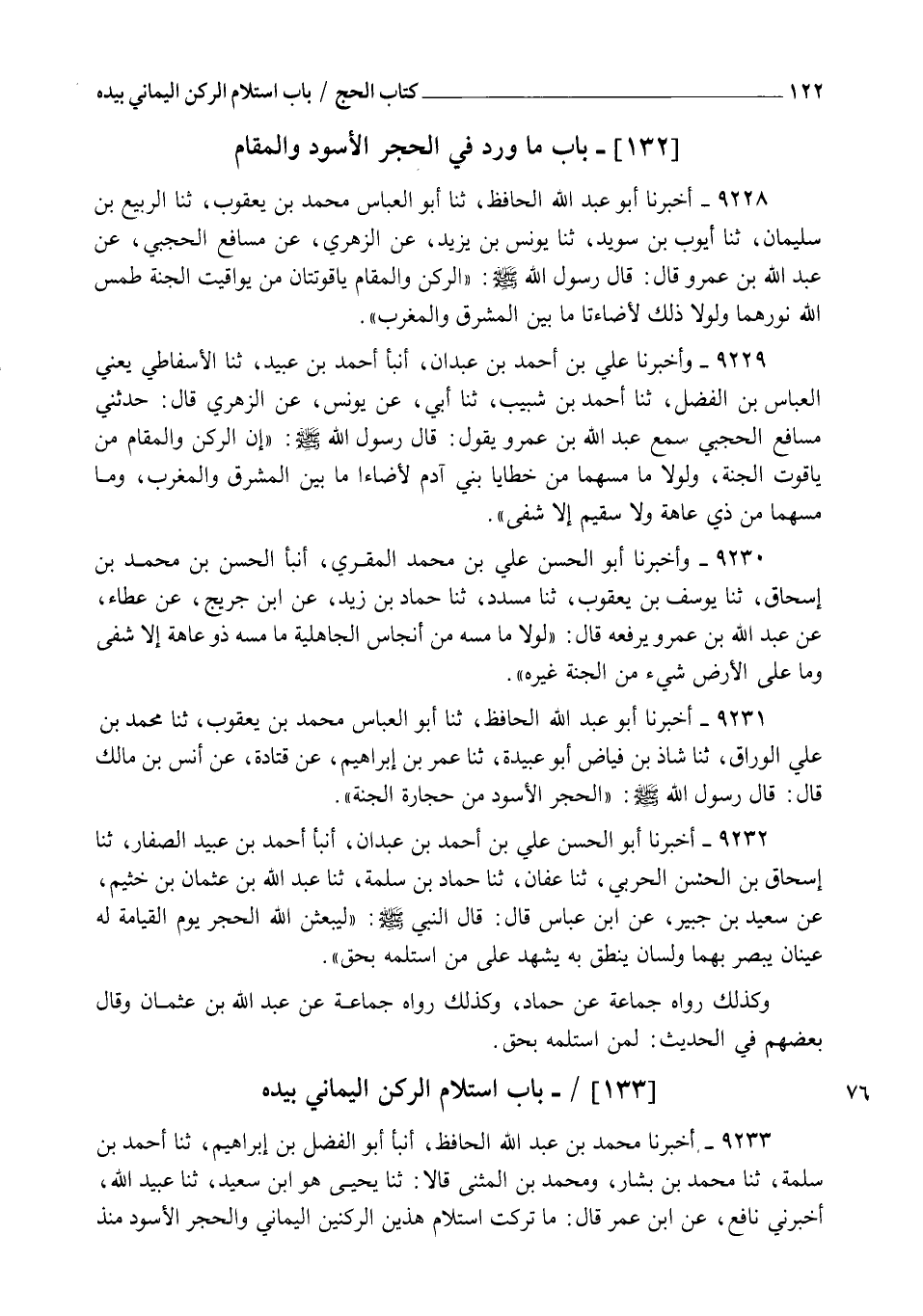 9232 - أَخْبَرَنَا أَبُو الْحَسَنِ عَلِيُّ بْنُ أَحْمَدَ بْنِ عَبْدَانَ , أنبأ أَحْمَدُ بْنُ عُبَيْدٍ الصَّفَّارُ , ثنا إِسْحَاقُ بْنُ الْحَسَنِ الْحَرْبِيُّ , ثنا عَفَّانُ , ثنا حَمَّادُ بْنُ سَلَمَةَ , ثنا عَبْدُ اللهِ بْنُ عُثْمَانَ بْنِ خُثَيْمٍ , عَنْ سَعِيدِ بْنِ جُبَيْرٍ , عَنِ ابْنِ عَبَّاسٍ , قَالَ: قَالَ النَّبِيُّ صَلَّى اللهُ عَلَيْهِ وَسَلَّمَ: §" لَيَبْعَثَنَّ اللهُ الْحَجَرَ يَوْمَ الْقِيَامَةِ لَهُ عَيْنَانِ يُبْصِرُ بِهِمَا وَلِسَانٌ يَنْطِقُ بِهِ يَشْهَدُ عَلَى مَنِ اسْتَلَمَهُ بِحَقٍّ " وَكَذَلِكَ رَوَاهُ جَمَاعَةٌ عَنْ حَمَّادٍ , وَكَذَلِكَ رَوَاهُ جَمَاعَةٌ عَنْ عَبْدِ اللهِ بْنِ عُثْمَانَ , وَقَالَ بَعْضُهُمْ فِي الْحَدِيثِ: " لِمَنِ اسْتَلَمَهُ بِحَقٍّ "