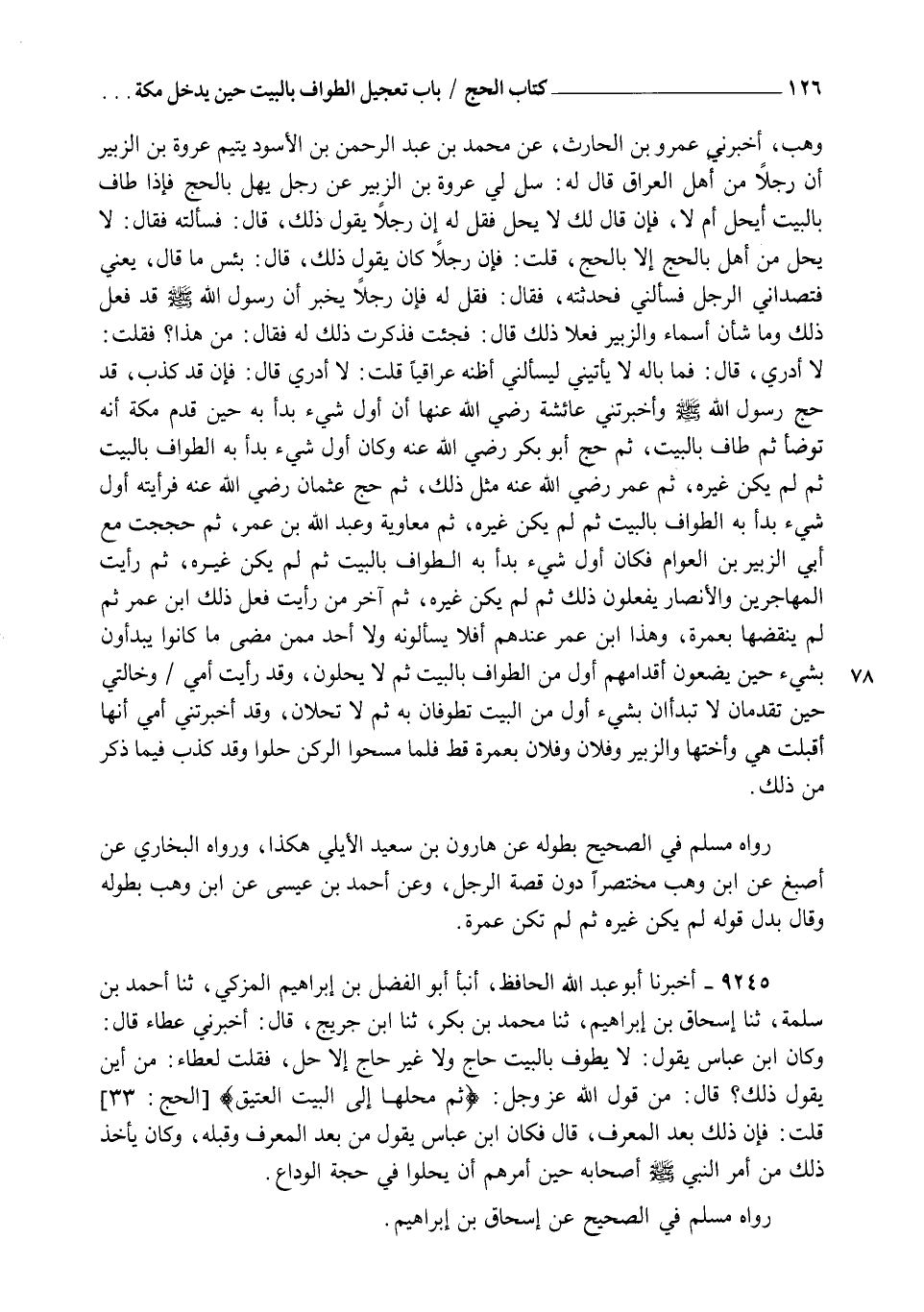 9245 - أَخْبَرَنَا أَبُو عَبْدِ اللهِ الْحَافِظُ , أنبأ أَبُو الْفَضْلِ بْنُ إِبْرَاهِيمَ الْمُزَكِّي , ثنا أَحْمَدُ بْنُ سَلَمَةَ , ثنا إِسْحَاقُ بْنُ إِبْرَاهِيمَ , ثنا مُحَمَّدُ بْنُ بَكْرٍ , ثنا ابْنُ جُرَيْجٍ , قَالَ: أَخْبَرَنِي عَطَاءٌ , قَالَ: وَكَانَ ابْنُ عَبَّاسٍ يَقُولُ: §" لَا يَطُوفُ بِالْبَيْتِ حَاجٌّ وَلَا غَيْرُ حَاجٍّ إِلَّا حَلَّ " , فَقُلْتُ لِعَطَاءٍ: مِنْ أَيْنَ يَقُولُ ذَلِكَ؟ قَالَ: مِنْ قَوْلِ اللهِ عَزَّ وَجَلَّ {ثُمَّ مَحِلُّهَا إِلَى الْبَيْتِ الْعَتِيقِ} [الحج: 33] قُلْتُ: فَإِنَّ ذَلِكَ بَعْدَ الْمُعَرَّفِ، قَالَ: فَكَانَ ابْنُ عَبَّاسٍ يَقُولُ: مِنْ بَعْدِ الْمُعَرَّفِ وَقَبْلَهُ، وَكَانَ يَأْخُذُ ذَلِكَ مِنْ أَمْرِ النَّبِيِّ صَلَّى اللهُ عَلَيْهِ وَسَلَّمَ أَصْحَابَهُ حِينَ أَمَرَهُمْ أَنْ يَحِلُّوا فِي حَجَّةِ الْوَدَاعِ رَوَاهُ مُسْلِمٌ فِي الصَّحِيحِ عَنْ إِسْحَاقَ بْنِ إِبْرَاهِيمَ. -[127]- قَالَ الشَّيْخُ: قَدْ رُوِّينَا عَنِ النَّبِيِّ صَلَّى اللهُ عَلَيْهِ وَسَلَّمَ ثُمَّ عَنْ أَبِي ذَرٍّ مَا دَلَّ عَلَى أَنَّ فَسْخَهُمُ الْحَجَّ بِالْعُمْرَةِ كَانَ خَاصًّا لِلرَّكْبِ مِنْ أَصْحَابِ النَّبِيِّ صَلَّى اللهُ عَلَيْهِ وَسَلَّمَ وَأَنَّ غَيْرَهُمْ إِذَا حَجُّوا , أَوْ قَرَنُوا ثُمَّ طَافُوا طَوَافَ الْقُدُومِ لَمْ يَحِلُّوا حَتَّى يَكُونَ يَوْمُ النَّحْرِ , فَيَحِلِّونَ بِمَا جُعِلَ بِهِ التَّحَلُّلُ , وَاللهُ أَعْلَمُ