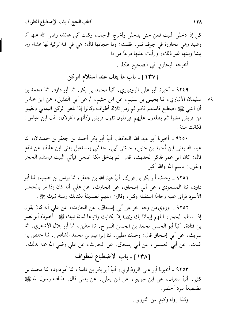 9249 - أَخْبَرَنَا أَبُو عَلِيٍّ الرُّوذْبَارِيُّ , أنبأ مُحَمَّدُ بْنُ بَكْرٍ , ثنا أَبُو دَاوُدَ , ثنا مُحَمَّدُ بْنُ سُلَيْمَانَ الْأَنْبَارِيُّ , ثنا يَحْيَى بْنُ سُلَيْمٍ , عَنِ ابْنِ خُثَيْمٍ , عَنْ أَبِي الطُّفَيْلِ , عَنِ ابْنِ عَبَّاسٍ " أَنَّ النَّبِيَّ صَلَّى اللهُ عَلَيْهِ وَسَلَّمَ §اضْطَبَعَ فَاسْتَلَمَ فَكَبَّرَ , ثُمَّ رَمَلَ ثَلَاثَةَ أَطْوَافٍ , وَكَانُوا إِذَا بَلَغُوا الرُّكْنَ الْيَمَانِيَّ وَتَغَيَّبُوا مِنْ قُرَيْشٍ مَشَوْا , ثُمَّ يَطْلُعُونَ عَلَيْهِمْ فَيَرْمُلُونَ تَقُولُ قُرَيْشٌ كَأَنَّهُمُ الْغِزْلَانُ " قَالَ ابْنُ عَبَّاسٍ: فَكَانَتْ سُنَّةً