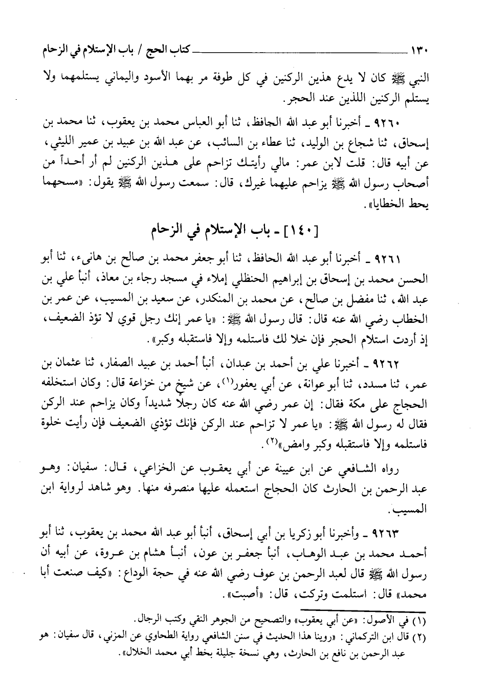9263 - وَأَخْبَرَنَا أَبُو زَكَرِيَّا بْنُ أَبِي إِسْحَاقَ , أنبأ أَبُو عَبْدِ اللهِ مُحَمَّدُ بْنُ يَعْقُوبَ , ثنا أَبُو أَحْمَدَ مُحَمَّدُ بْنُ عَبْدِ الْوَهَّابِ , أنبأ جَعْفَرُ بْنُ عَوْنٍ , أنبأ هِشَامُ بْنُ عُرْوَةَ , عَنْ أَبِيهِ أَنَّ رَسُولَ اللهِ صَلَّى اللهُ عَلَيْهِ وَسَلَّمَ قَالَ لِعَبْدِ الرَّحْمَنِ بْنِ عَوْفٍ رَضِيَ اللهُ عَنْهُ فِي حَجَّةِ الْوَدَاعِ: " " §كَيْفَ صَنَعْتَ أَبَا مُحَمَّدٍ؟ " " قَالَ: اسْتَلَمْتُ وَتَرَكْتُ , قَالَ: " " أَصَبْتَ " " -[131]- هَذَا مُرْسَلٌ , وَكَذَلِكَ رَوَاهُ مَالِكٌ عَنْ هِشَامٍ. قَالَ الشَّافِعِيُّ: وَأَحْسَبُ النَّبِيَّ صَلَّى اللهُ عَلَيْهِ وَسَلَّمَ قَالَ لِعَبْدِ الرَّحْمَنِ: " " أَصَبْتَ " " أَنَّهُ وَصَفَ لَهُ أَنَّهُ اسْتَلَمَ فِي غَيْرِ زِحَامٍ , وَتَرَكَ فِي زِحَامٍ