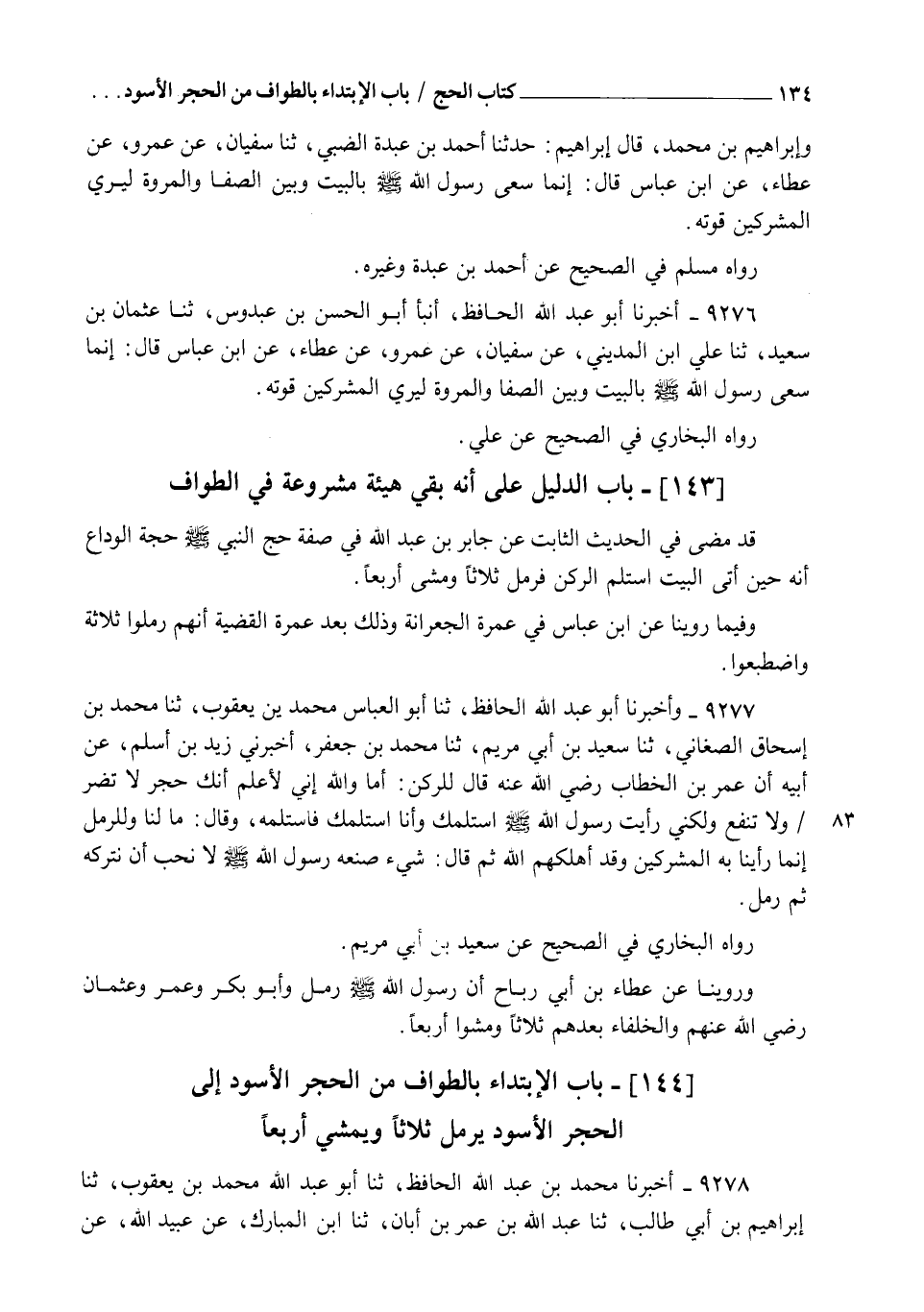 9277 - وَأَخْبَرَنَا أَبُو عَبْدِ اللهِ الْحَافِظُ , ثنا أَبُو الْعَبَّاسِ مُحَمَّدُ بْنُ يَعْقُوبَ , ثنا مُحَمَّدُ بْنُ إِسْحَاقَ الصَّغَانِيُّ , ثنا سَعِيدُ بْنُ أَبِي مَرْيَمَ , ثنا مُحَمَّدُ بْنُ جَعْفَرٍ , أَخْبَرَنِي زَيْدُ بْنُ أَسْلَمَ , عَنْ أَبِيهِ أَنَّ عُمَرَ بْنَ الْخَطَّابِ رَضِيَ اللهُ عَنْهُ , قَالَ لِلرُّكْنِ: " أَمَا وَاللهِ إِنِّي لَأَعْلَمُ أَنَّكَ §حَجَرٌ لَا تَضُرُّ وَلَا تَنْفَعُ , وَلَكِنِّي رَأَيْتُ رَسُولَ اللهِ صَلَّى اللهُ عَلَيْهِ وَسَلَّمَ اسْتَلَمَكَ , وَأَنَا أَسْتَلِمُكَ , فَاسْتَلَمَهُ , وَقَالَ: مَا لَنَا وَلِلرَّمَلِ؟ إِنَّمَا رَأَيْنَا بِهِ الْمُشْرِكِينَ وَقَدْ أَهْلَكُهُمُ اللهُ " ثُمَّ قَالَ: " شَيْءٌ صَنَعَهُ رَسُولُ اللهِ صَلَّى اللهُ عَلَيْهِ وَسَلَّمَ لَا نُحِبُّ أَنْ نَتْرُكَهُ " ثُمَّ رَمَلَ رَوَاهُ الْبُخَارِيُّ فِي الصَّحِيحِ , عَنْ سَعِيدِ بْنِ أَبِي مَرْيَمَ وَرُوِّينَا عَنْ عَطَاءِ بْنِ أَبِي رَبَاحٍ " أَنَّ رَسُولَ اللهِ صَلَّى اللهُ عَلَيْهِ وَسَلَّمَ رَمَلَ , وَأَبُو بَكْرٍ , وَعُمَرُ , وَعُثْمَانُ رَضِيَ اللهُ عَنْهُمْ، وَالْخُلَفَاءُ بَعْدَهُمْ ثَلَاثًا وَمَشَوْا أَرْبَعًا "