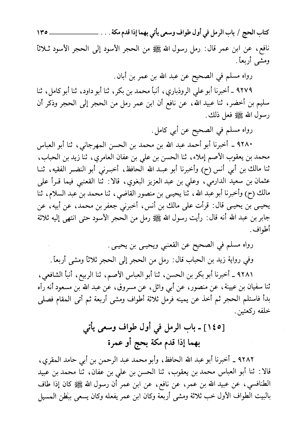 9280 - أَخْبَرَنَا أَبُو أَحْمَدَ عَبْدُ اللهِ بْنُ مُحَمَّدِ بْنِ الْحَسَنِ الْمِهْرَجَانِيُّ , ثنا أَبُو الْعَبَّاسِ مُحَمَّدُ بْنُ يَعْقُوبَ الْأَصَمُّ إِمْلَاءً , ثنا الْحَسَنُ بْنُ عَلِيِّ بْنِ عَفَّانَ الْعَامِرِيُّ , ثنا زَيْدُ بْنُ الْحُبَابِ , ثنا مَالِكُ بْنُ أَنَسٍ , ح وَأَخْبَرَنَا أَبُو عَبْدِ اللهِ الْحَافِظُ , أَخْبَرَنِي أَبُو النَّضْرِ الْفَقِيهُ , ثنا عُثْمَانُ بْنُ سَعِيدٍ الدَّارِمِيُّ , وَعَلِيُّ بْنُ عَبْدِ الْعَزِيزِ الْبَغَوِيُّ , قَالَا: ثنا الْقَعْنَبِيُّ , فِيمَا قَرَأَ عَلَى مَالِكٍ ح وَأَخْبَرَنَا أَبُو عَبْدِ اللهِ , ثنا يَحْيَى بْنُ مَنْصُورٍ الْقَاضِي , ثنا مُحَمَّدُ بْنُ عَبْدِ السَّلَامِ , ثنا يَحْيَى بْنُ يَحْيَى , قَالَ: قَرَأْتُ عَلَى مَالِكِ بْنِ أَنَسٍ , أَخْبَرَنِي جَعْفَرُ بْنُ مُحَمَّدٍ , عَنْ أَبِيهِ , عَنْ جَابِرِ بْنِ عَبْدِ اللهِ أَنَّهُ قَالَ: " رَأَيْتُ رَسُولَ اللهِ صَلَّى اللهُ عَلَيْهِ وَسَلَّمَ §رَمَلَ مِنَ الْحَجَرِ الْأَسْوَدِ حَتَّى انْتَهَى إِلَيْهِ ثَلَاثَةَ أَطْوَافٍ " رَوَاهُ مُسْلِمٌ فِي الصَّحِيحِ , عَنِ الْقَعْنَبِيِّ وَيَحْيَى بْنِ يَحْيَى وَفِي رِوَايَةِ زَيْدِ بْنِ الْحُبَابِ , قَالَ: " رَمَلَ مِنَ الْحَجَرِ إِلَى الْحَجَرِ ثَلَاثًا وَمَشَى أَرْبَعًا "