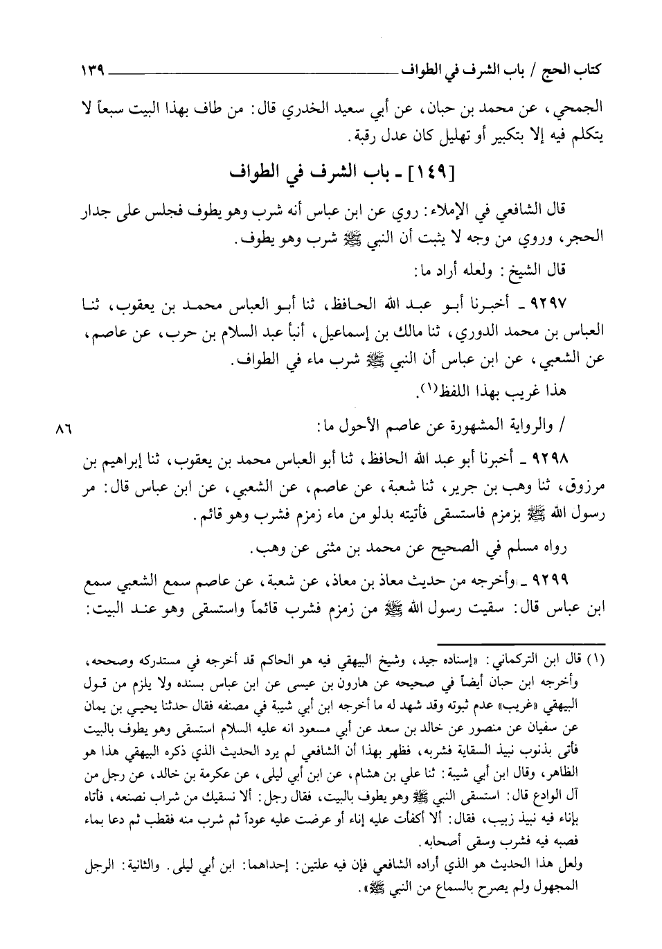 9297 - أَخْبَرَنَا أَبُو عَبْدِ اللهِ الْحَافِظُ , ثنا أَبُو الْعَبَّاسِ مُحَمَّدُ بْنُ يَعْقُوبَ , ثنا الْعَبَّاسُ بْنُ مُحَمَّدٍ الدُّورِيُّ , ثنا مَالِكُ بْنُ إِسْمَاعِيلَ , أنبأ عَبْدُ السَّلَامِ بْنُ حَرْبٍ , عَنْ عَاصِمٍ , عَنِ الشَّعْبِيِّ , عَنِ ابْنِ عَبَّاسٍ " أَنَّ النَّبِيَّ صَلَّى اللهُ عَلَيْهِ وَسَلَّمَ §شَرِبَ مَاءً فِي الطَّوَافِ " هَذَا غَرِيبٌ بِهَذَا اللَّفْظِ , وَالرِّوَايَةُ الْمَشْهُورَةُ عَنْ عَاصِمٍ الْأَحْوَلِ مَا