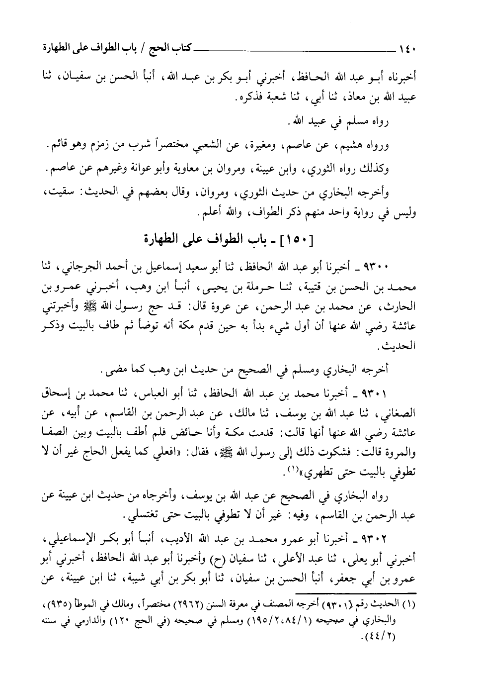 9301 - أَخْبَرَنَا مُحَمَّدُ بْنُ عَبْدِ اللهِ الْحَافِظُ , ثنا أَبُو الْعَبَّاسِ , ثنا مُحَمَّدُ بْنُ إِسْحَاقَ الصَّغَانِيُّ , ثنا عَبْدُ اللهِ بْنُ يُوسُفَ , ثنا مَالِكٌ , عَنْ عَبْدِ الرَّحْمَنِ بْنِ الْقَاسِمِ , عَنْ أَبِيهِ , عَنْ عَائِشَةَ رَضِيَ اللهُ عَنْهَا أَنَّهَا قَالَتْ: قَدِمْتُ مَكَّةَ وَأَنَا حَائِضٌ فَلَمْ أَطُفْ بِالْبَيْتِ وَبَيْنَ الصَّفَا وَالْمَرْوَةِ , قَالَتْ: فَشَكَوْتُ ذَلِكَ إِلَى رَسُولِ اللهِ صَلَّى اللهُ عَلَيْهِ وَسَلَّمَ , فَقَالَ: §" افْعَلِي كَمَا يَفْعَلُ الْحَاجُّ غَيْرَ أَنْ لَا تَطُوفِي بِالْبَيْتِ حَتَّى تَطْهُرِي " رَوَاهُ الْبُخَارِيُّ فِي الصَّحِيحِ , عَنْ عَبْدِ اللهِ بْنِ يُوسُفَ وَأَخْرَجَاهُ مِنْ حَدِيثِ ابْنِ عُيَيْنَةَ , عَنْ عَبْدِ الرَّحْمَنِ بْنِ الْقَاسِمِ وَفِيهِ: " غَيْرَ أَنْ لَا تَطُوفِي بِالْبَيْتِ حَتَّى تَغْتَسِلِي "