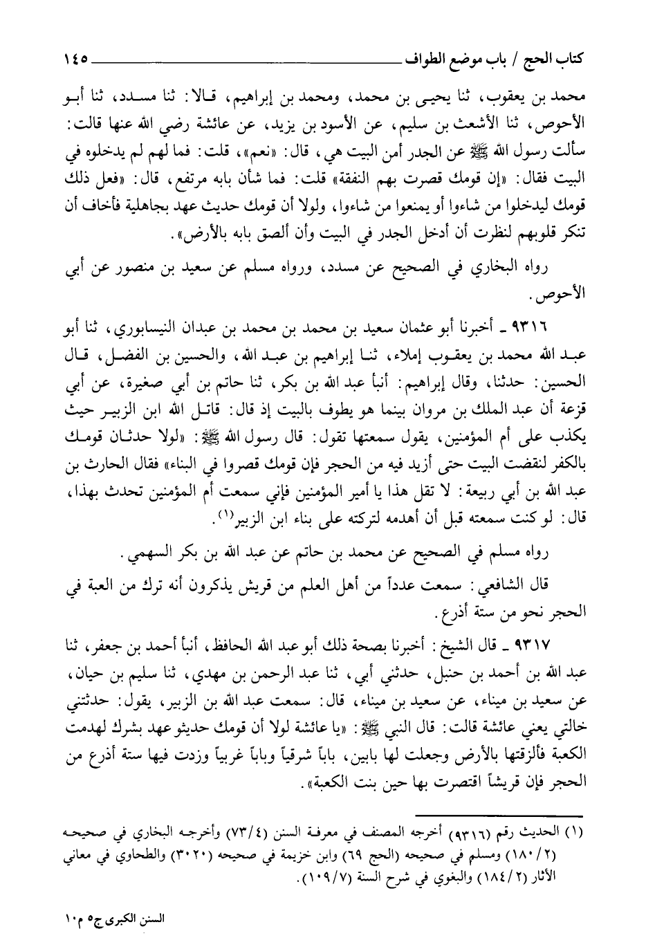 9316 - أَخْبَرَنَا أَبُو عُثْمَانَ سَعِيدُ بْنُ مُحَمَّدِ بْنِ مُحَمَّدِ بْنِ عَبْدَانَ النَّيْسَابُورِيُّ , ثنا أَبُو عَبْدِ اللهِ مُحَمَّدُ بْنُ يَعْقُوبَ إِمْلَاءً , ثنا إِبْرَاهِيمُ بْنُ عَبْدِ اللهِ , وَالْحُسَيْنُ بْنُ الْفَضْلِ , قَالَ الْحُسَيْنُ: حَدَّثَنَا وَقَالَ , إِبْرَاهِيمُ: أنبأ عَبْدُ اللهِ بْنُ بَكْرٍ , ثنا حَاتِمُ بْنُ أَبِي صَغِيرَةَ , عَنْ أَبِي قَزَعَةَ أَنَّ عَبْدَ الْمَلِكِ بْنَ مَرْوَانَ بَيْنَمَا هُوَ يَطُوفُ بِالْبَيْتِ إِذْ قَالَ: قَاتَلَ اللهُ ابْنَ الزُّبَيْرِ حَيْثُ يَكْذِبُ عَلَى أُمِّ الْمُؤْمِنِينَ يَقُولُ: سَمِعْتُهَا تَقُولُ: قَالَ رَسُولُ اللهِ صَلَّى اللهُ عَلَيْهِ وَسَلَّمَ: §" لَوْلَا حِدْثَانُ قَوْمِكِ بِالْكُفْرِ لَنَقَضْتُ الْبَيْتَ حَتَّى أَزِيدَ فِيهِ مِنَ الْحِجْرِ , فَإِنَّ قَوْمَكِ قَصَّرُوا فِي الْبِنَاءِ ". فَقَالَ الْحَارِثُ بْنُ عَبْدِ اللهِ بْنِ أَبِي رَبِيعَةَ: لَا تَقُلْ هَذَا يَا أَمِيرَ الْمُؤْمِنِينَ , فَإِنِّي سَمِعْتُ أُمَّ الْمُؤْمِنِينَ تُحَدِّثُ بِهَذَا , قَالَ: لَوْ كُنْتُ سَمِعْتُهُ قَبْلَ أَنْ أَهْدِمَهُ لَتَرَكْتُهُ عَلَى بِنَاءِ ابْنِ الزُّبَيْرِ رَوَاهُ مُسْلِمٌ فِي الصَّحِيحِ , عَنْ مُحَمَّدِ بْنِ حَاتِمٍ , عَنْ عَبْدِ اللهِ بْنِ بَكْرٍ السَّهْمِيِّ , قَالَ الشَّافِعِيُّ: سَمِعْتُ عَدَدًا مِنْ أَهْلِ الْعِلْمِ مِنْ قُرَيْشٍ يَذْكُرُونَ أَنَّهُ تُرِكَ مِنَ الْكَعْبَةِ فِي الْحِجْرِ نَحْوٌ مِنْ سِتَّةِ أَذْرُعٍ