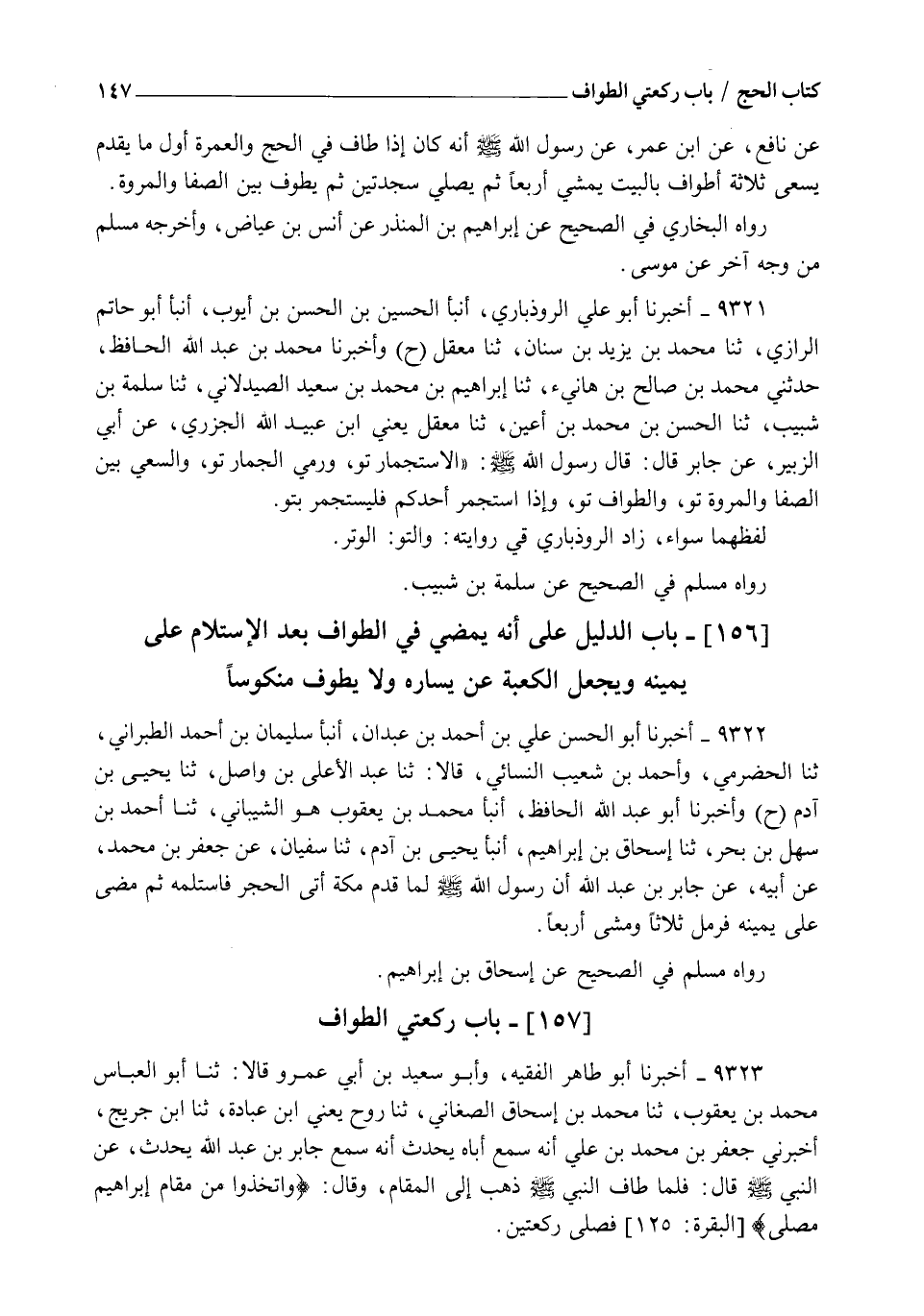 9323 - أَخْبَرَنَا أَبُو طَاهِرٍ الْفَقِيهُ , وَأَبُو سَعِيدِ بْنُ أَبِي عَمْرٍو قَالَا: ثنا أَبُو الْعَبَّاسِ مُحَمَّدُ بْنُ يَعْقُوبَ , ثنا مُحَمَّدُ بْنُ إِسْحَاقَ الصَّغَانِيُّ , ثنا رَوْحٌ , يَعْنِي ابْنَ عُبَادَةَ , ثنا ابْنُ جُرَيْجٍ , أَخْبَرَنِي جَعْفَرُ بْنُ مُحَمَّدِ بْنِ عَلِيٍّ أَنَّهُ سَمِعَ أَبَاهُ يُحَدِّثُ أَنَّهُ سَمِعَ جَابِرَ بْنَ عَبْدِ اللهِ يُحَدِّثُ عَنِ النَّبِيِّ صَلَّى اللهُ عَلَيْهِ وَسَلَّمَ , قَالَ: §" فَلَمَّا طَافَ النَّبِيُّ صَلَّى اللهُ عَلَيْهِ وَسَلَّمَ ذَهَبَ إِلَى الْمَقَامِ وَقَالَ: {وَاتَّخِذُوا مِنْ مَقَامِ إِبْرَاهِيمَ مُصَلًّى} [البقرة: 125] فَصَلَّى رَكْعَتَيْنِ "