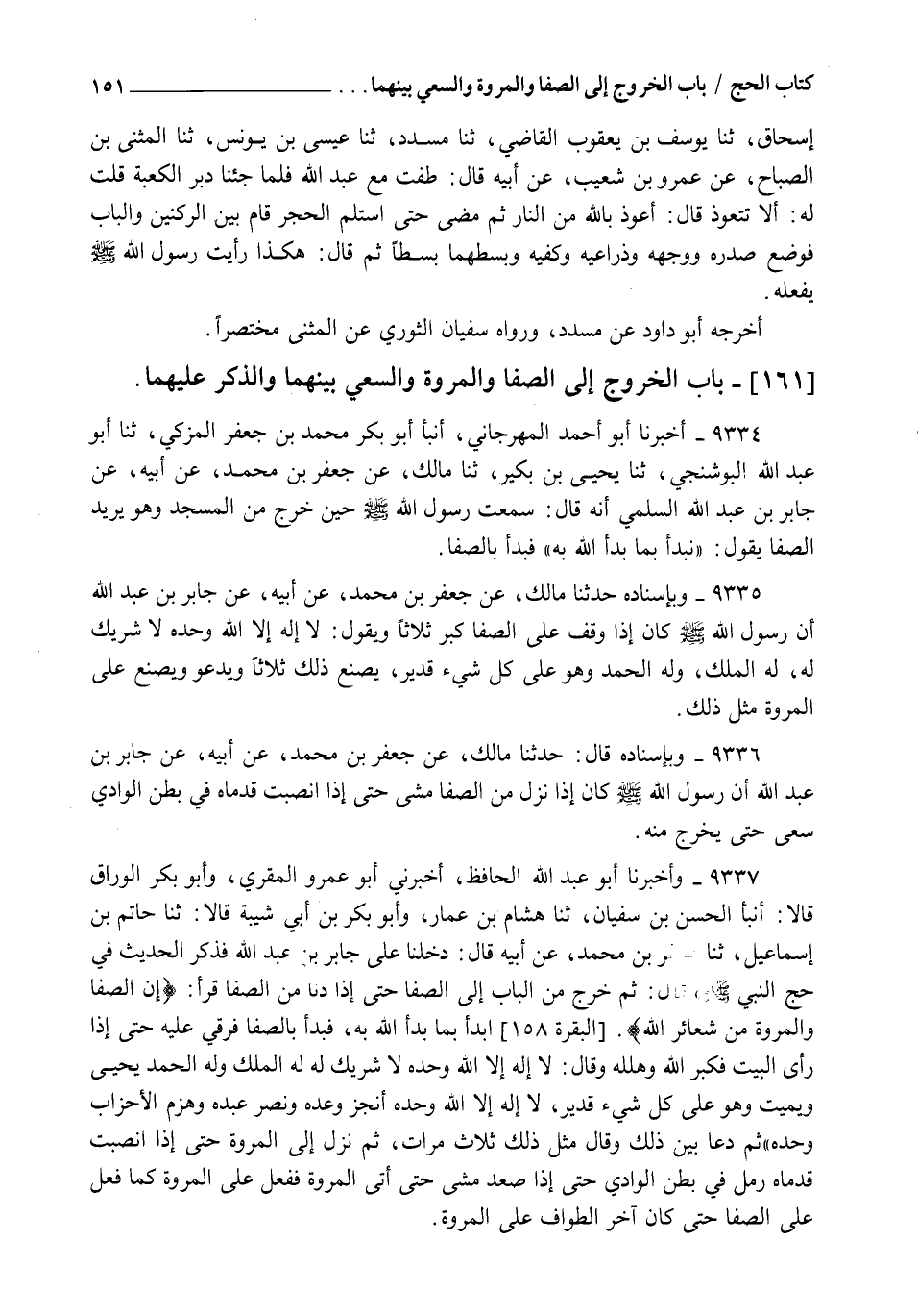 9337 - وَأَخْبَرَنَا أَبُو عَبْدِ اللهِ الْحَافِظُ , أَخْبَرَنِي أَبُو عَمْرٍو الْمُقْرِئُ , وَأَبُو بَكْرٍ الْوَرَّاقُ قَالَا: أنبأ الْحَسَنُ بْنُ سُفْيَانَ , ثنا هِشَامُ بْنُ عَمَّارٍ , وَأَبُو بَكْرِ بْنُ أَبِي شَيْبَةَ قَالَا: ثنا حَاتِمُ بْنُ إِسْمَاعِيلَ , ثنا جَعْفَرُ بْنُ مُحَمَّدٍ , عَنْ أَبِيهِ , قَالَ: دَخَلْنَا عَلَى جَابِرِ بْنِ عَبْدِ اللهِ , فَذَكَرَ الْحَدِيثَ فِي حَجِّ النَّبِيِّ صَلَّى اللهُ عَلَيْهِ وَسَلَّمَ , قَالَ: ثُمَّ خَرَجَ مِنَ الْبَابِ إِلَى الصَّفَا حَتَّى إِذَا دَنَا مِنَ الصَّفَا قَرَأَ {إِنَّ الصَّفَا وَالْمَرْوَةَ مِنْ شَعَائِرِ اللهِ} [البقرة: 158] أبْدَأُ بِمَا بَدَأَ اللهُ بِهِ , فَبَدَأَ بِالصَّفَا فَرَقِيَ عَلَيْهِ حَتَّى إِذَا رَأَى الْبَيْتَ فَكَبَّرَ اللهَ وَهَلَّلَهُ , وَقَالَ: §" لَا إِلَهَ إِلَّا اللهُ وَحْدَهُ لَا شَرِيكَ لَهُ , لَهُ الْمُلْكُ , وَلَهُ الْحَمْدُ يُحْيِي وَيُمِيتُ , وَهُوَ عَلَى كُلِّ شَيْءٍ قَدِيرٌ , لَا إِلَهَ إِلَّا اللهُ وَحْدَهُ أَنْجَزَ وَعْدَهُ وَنَصَرَ عَبْدَهُ , وَهَزَمَ الْأَحْزَابَ وَحْدَهُ " , ثُمَّ دَعَا بَيْنَ ذَلِكَ وَقَالَ مِثْلَ ذَلِكَ ثَلَاثَ مَرَّاتٍ , ثُمَّ نَزَلَ إِلَى الْمَرْوَةِ حَتَّى إِذَا انْصَبَّتْ قَدَمَاهُ رَمَلَ فِي بَطْنِ الْوَادِي حَتَّى إِذَا صَعِدَ مَشَى حَتَّى أَتَى الْمَرْوَةَ فَفَعَلَ عَلَى الْمَرْوَةِ كَمَا فَعَلَ عَلَى الصَّفَا حَتَّى كَانَ آخِرُ الطَّوَافِ عَلَى الْمَرْوَةِ -[152]- رَوَاهُ مُسْلِمٌ فِي الصَّحِيحِ , عَنْ أَبِي بَكْرِ بْنِ أَبِي شَيْبَةَ دُونَ قَوْلِهِ: " يُحْيِي وَيُمِيتُ "