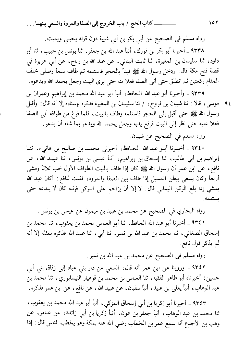 9339 - وَأَخْبَرَنَا أَبُو عَبْدِ اللهِ الْحَافِظُ , أنبأ أَبُو عَبْدِ اللهِ مُحَمَّدُ بْنُ يَعْقُوبَ، ثنا مُحَمَّدُ بْنُ إِبْرَاهِيمَ , وَعِمْرَانُ بْنُ مُوسَى قَالَا: ثنا شَيْبَانُ بْنُ فَرُّوخَ , ثنا سُلَيْمَانُ بْنُ الْمُغِيرَةِ , فَذَكَرَهُ بِإِسْنَادِهِ إِلَّا أَنَّهُ قَالَ: وَأَقْبَلَ رَسُولُ اللهِ صَلَّى اللهُ عَلَيْهِ وَسَلَّمَ حَتَّى §أَقْبَلَ إِلَى الْحَجَرِ فَاسْتَلَمَهُ وَطَافَ بِالْبَيْتِ فَلَمَّا فَرَغَ مِنْ طَوَافِهِ أَتَى الصَّفَا فَعَلَا عَلَيْهِ حَتَّى نَظَرَ إِلَى الْبَيْتِ فَرَفَعَ يَدَيْهِ , وَجَعَلَ يَحْمَدُ اللهَ وَيَدْعُو بِمَا شَاءَ أَنْ يَدْعُوَ رَوَاهُ مُسْلِمٌ فِي الصَّحِيحِ , عَنْ شَيْبَانَ
