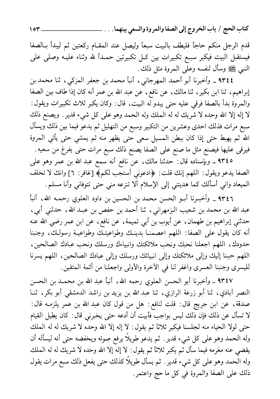 9347 - وَأَخْبَرَنَا أَبُو الْحَسَنِ الْعَلَوِيُّ رَحِمَهُ اللهُ , أنبأ عَبْدُ اللهِ بْنُ مُحَمَّدِ بْنِ الْحَسَنِ النَّصْرَآبَاذِيُّ , ثنا أَبُو زُرْعَةَ الرَّازِيُّ , ثنا عَبْدُ اللهِ بْنُ يَزِيدَ بْنِ رَاشِدٍ الدِّمَشْقِيُّ أَبُو بَكْرٍ , ثنا صَدَقَةُ , عَنِ ابْنِ جُرَيْجٍ , قَالَ: قُلْتُ لِنَافِعٍ: هَلْ مِنْ قَوْلٍ كَانَ عَبْدُ اللهِ بْنُ عُمَرَ يَلْزَمُهُ؟ قَالَ: لَا تَسْأَلْ عَنْ ذَلِكَ فَإِنَّ ذَلِكَ لَيْسَ بِوَاجِبٍ فَأَبَيْتُ أَنْ أَدَعَهُ حَتَّى يُخْبِرَنِي , قَالَ: كَانَ يُطِيلُ الْقِيَامَ حَتَّى لَوْلَا الْحَيَاءُ مِنْهُ لَجَلَسْنَا فَيُكَبِّرُ ثَلَاثًا , ثُمَّ يَقُولُ: §" لَا إِلَهَ إِلَّا اللهُ وَحْدَهُ لَا شَرِيكَ لَهُ , لَهُ الْمُلْكُ , وَلَهُ الْحَمْدُ وَهُوَ عَلَى كُلِّ شَيْءٍ قَدِيرٌ " , ثُمَّ يَدْعُو طَوِيلًا يَرْفَعُ صَوْتَهُ وَيَخْفِضُهُ حَتَّى إِنَّهُ لَيَسْأَلُهُ أَنْ يَقْضِيَ عَنْهُ مَغْرَمَهُ فِيمَا سَأَلَ , ثُمَّ يُكَبِّرُ ثَلَاثًا , ثُمَّ يَقُولُ: " لَا إِلَهَ إِلَّا اللهُ وَحْدَهُ لَا شَرِيكَ لَهُ , لَهُ الْمُلْكُ , وَلَهُ الْحَمْدُ وَهُوَ عَلَى كُلِّ شَيْءٍ قَدِيرٌ " ثُمَّ يَسْأَلُ طَوِيلًا كَذَلِكَ حَتَّى يَفْعَلَ ذَلِكَ سَبْعَ مَرَّاتٍ , يَقُولُ ذَلِكَ عَلَى الصَّفَا وَالْمَرْوَةِ فِي كُلِّ مَا حَجَّ وَاعْتَمَرَ -[154]-