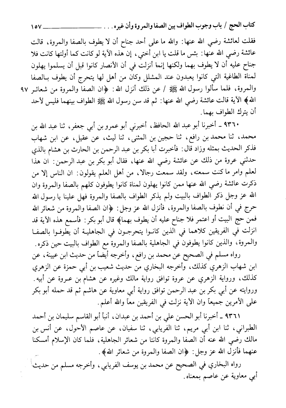 9361 - أَخْبَرَنَا أَبُو الْحَسَنِ عَلِيُّ بْنُ أَحْمَدَ بْنِ عَبْدَانَ , أنبأ أَبُو الْقَاسِمِ سُلَيْمَانُ بْنُ أَحْمَدَ الطَّبَرَانِيُّ , ثنا ابْنُ أَبِي مَرْيَمَ , ثنا الْفِرْيَابِيُّ , ثنا سُفْيَانُ , عَنْ عَاصِمٍ الْأَحْوَلِ , عَنْ أَنَسِ بْنِ مَالِكٍ رَضِيَ اللهُ عَنْهُ §أَنَّ الصَّفَا , وَالْمَرْوَةَ كَانَتَا مِنْ شَعَائِرِ الْجَاهِلِيَّةِ , فَلَمَّا كَانَ الْإِسْلَامُ أَمْسَكْنَا عَنْهُمَا , فَأَنْزَلَ اللهُ عَزَّ وَجَلَّ {إنَّ الصَّفَا وَالْمَرْوَةَ مِنْ شَعَائِرِ اللهِ} [البقرة: 158] رَوَاهُ الْبُخَارِيُّ فِي الصَّحِيحِ عَنْ مُحَمَّدِ بْنِ يُوسُفَ الْفِرْيَابِيِّ , وَأَخْرَجَهُ مُسْلِمٌ مِنْ حَدِيثِ أَبِي مُعَاوِيَةَ , عَنْ عَاصِمٍ بِمَعْنَاهُ