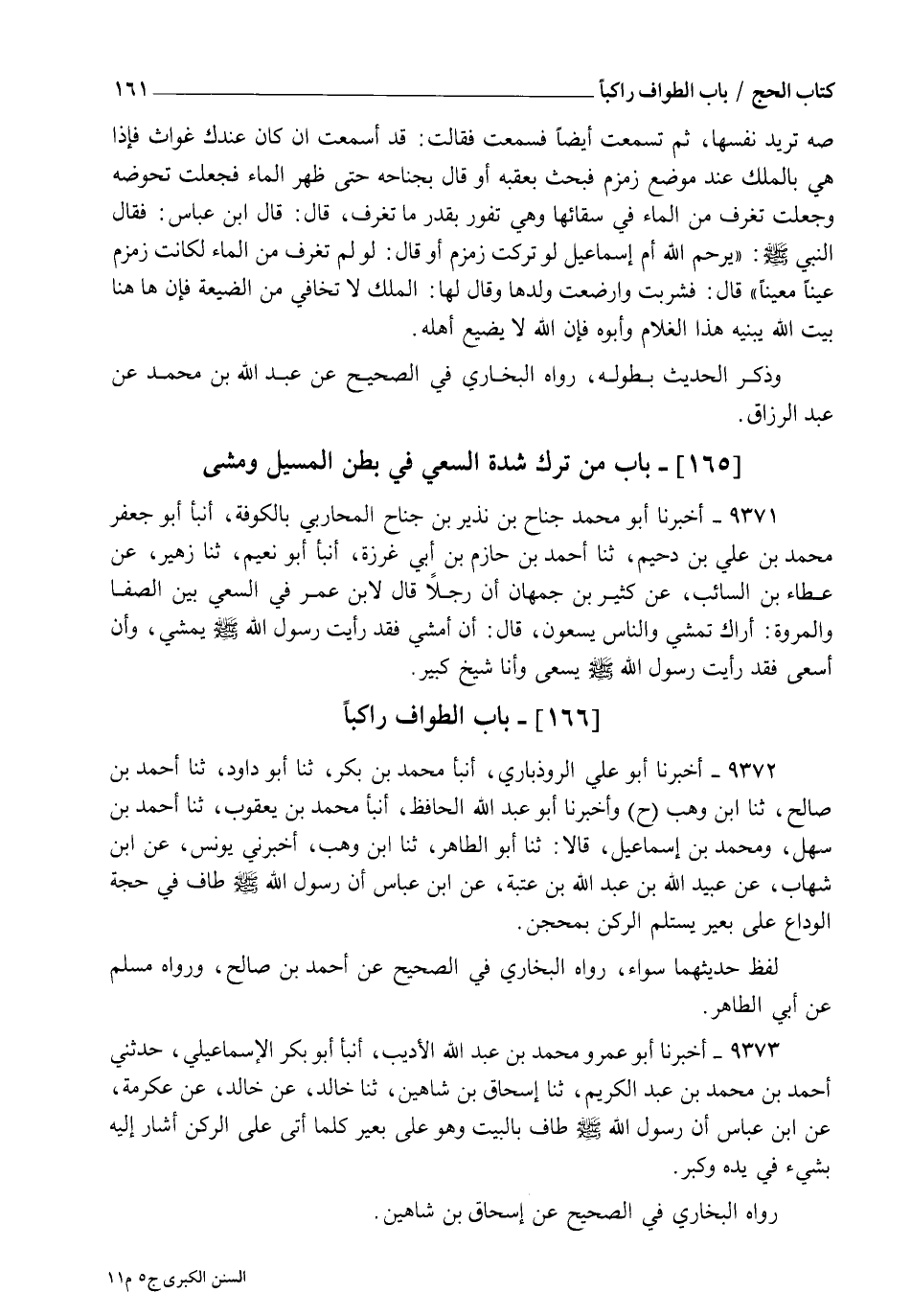 9372 - أَخْبَرَنَا أَبُو عَلِيٍّ الرُّوذْبَارِيُّ , أنبأ مُحَمَّدُ بْنُ بَكْرٍ , ثنا أَبُو دَاوُدَ , ثنا أَحْمَدُ بْنُ صَالِحٍ , ثنا ابْنُ وَهْبٍ , ح وَأَخْبَرَنَا أَبُو عَبْدِ اللهِ الْحَافِظُ , أنبأ مُحَمَّدُ بْنُ يَعْقُوبَ , ثنا أَحْمَدُ بْنُ سَهْلٍ , وَمُحَمَّدُ بْنُ إِسْمَاعِيلَ , قَالَا: ثنا أَبُو الطَّاهِرِ , ثنا ابْنُ وَهْبٍ , أَخْبَرَنِي يُونُسُ , عَنِ ابْنِ شِهَابٍ , عَنْ عُبَيْدِ اللهِ بْنِ عَبْدِ اللهِ بْنِ عُتْبَةَ , عَنِ ابْنِ عَبَّاسٍ أَنَّ رَسُولَ اللهِ صَلَّى اللهُ عَلَيْهِ وَسَلَّمَ §طَافَ فِي حَجَّةِ الْوَدَاعِ عَلَى بَعِيرٍ يَسْتَلِمُ الرُّكْنَ بِمِحْجَنٍ لَفْظُ حَدِيثِهِمَا سَوَاءٌ رَوَاهُ الْبُخَارِيُّ فِي الصَّحِيحِ عَنْ أَحْمَدَ بْنِ صَالِحٍ , وَرَوَاهُ مُسْلِمٌ عَنْ أَبِي الطَّاهِرِ