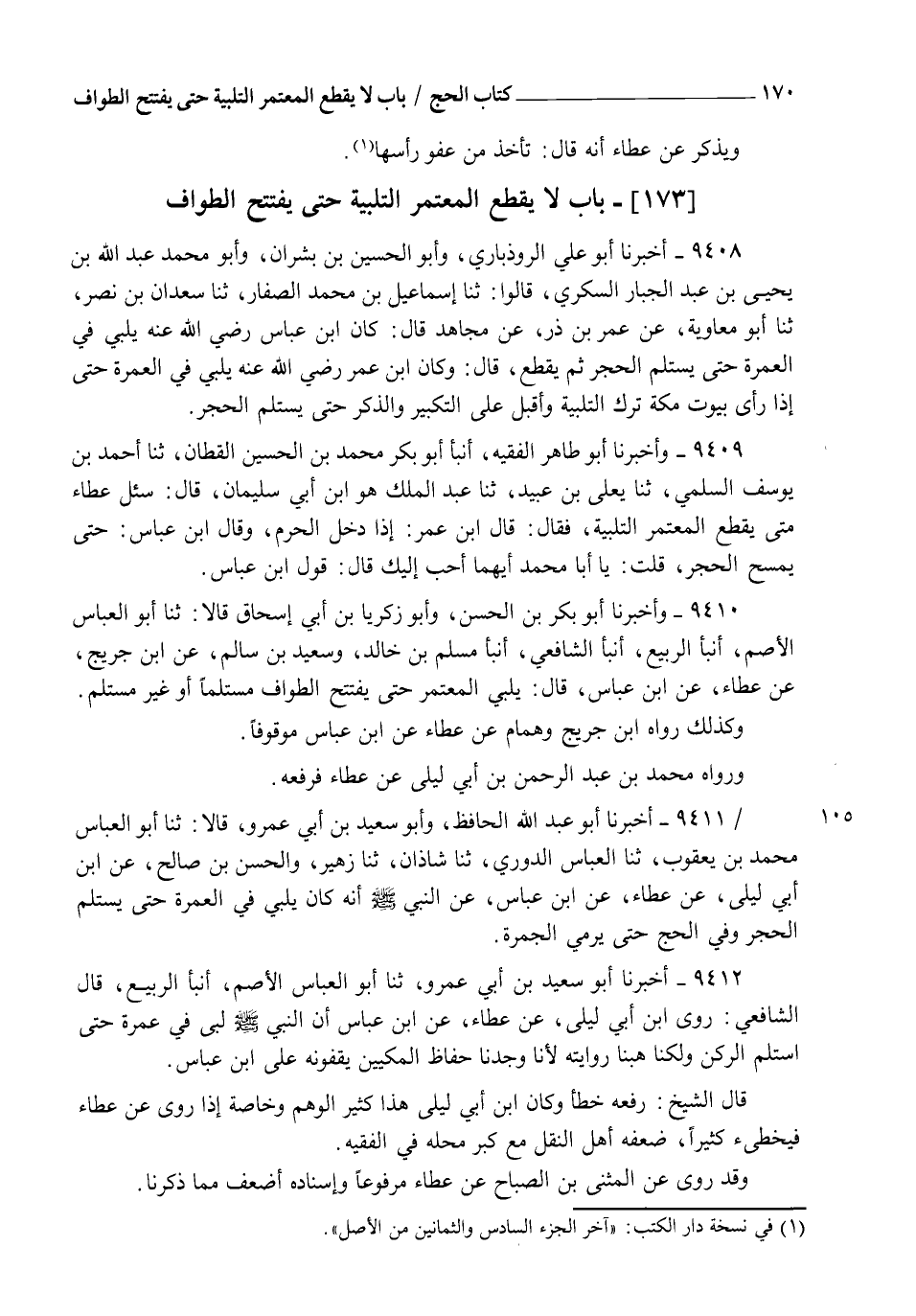 9410 - وَأَخْبَرَنَا أَبُو بَكْرِ بْنُ الْحَسَنِ , وَأَبُو زَكَرِيَّا بْنُ أَبِي إِسْحَاقَ قَالَا: ثنا أَبُو الْعَبَّاسِ الْأَصَمُّ , أنبأ الرَّبِيعُ , أنبأ الشَّافِعِيُّ , أنبأ مُسْلِمُ بْنُ خَالِدٍ , وَسَعِيدُ بْنُ سَالِمٍ , عَنِ ابْنِ جُرَيْجٍ , عَنْ عَطَاءٍ , عَنِ ابْنِ عَبَّاسٍ , قَالَ: §يُلَبِّي الْمُعْتَمِرُ حَتَّى يَفْتَتِحَ الطَّوَافَ مُسْتَلِمًا , أَوْ غَيْرَ مُسْتَلِمٍ وَكَذَلِكَ رَوَاهُ ابْنُ جُرَيْجٍ وَهَمَّامٌ , عَنْ عَطَاءٍ , عَنِ ابْنِ عَبَّاسٍ مَوْقُوفًا , وَرَوَاهُ مُحَمَّدُ بْنُ عَبْدِ الرَّحْمَنِ بْنِ أَبِي لَيْلَى , عَنْ عَطَاءٍ فَرَفَعَهُ