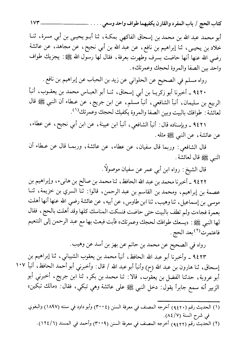 9423 - وَأَخْبَرَنَا أَبُو عَبْدِ اللهِ الْحَافِظُ , أنبأ مُحَمَّدُ بْنُ يَعْقُوبَ الشَّيْبَانِيُّ , ثنا إِبْرَاهِيمُ بْنُ إِسْحَاقَ , ثنا هَارُونُ بْنُ عَبْدِ اللهِ , ح وَأنبأ أَبُو عَبْدِ اللهِ , قَالَ: وَأَخْبَرَنِي أَبُو أَحْمَدَ الْحَافِظُ , أنبأ أَبُو عَرُوبَةَ , حَدَّثَنَا الْفَضْلُ بْنُ يَعْقُوبَ , قَالَا: ثنا مُحَمَّدُ بْنُ بَكْرٍ , ثنا ابْنُ جُرَيْجٍ , أَخْبَرَنِي أَبُو الزُّبَيْرِ، أَنَّهُ سَمِعَ جَابِرًا , يَقُولُ: دَخَلَ النَّبِيُّ صَلَّى اللهُ عَلَيْهِ وَسَلَّمَ عَلَى عَائِشَةَ وَهِيَ تَبْكِي , فَقَالَ: " §مَا لَكِ تَبْكِينَ؟ " -[174]- قَالَتْ: أَبْكِي أَنَّ النَّاسَ حَلُّوا وَلَمْ أَحْلِلْ , وَطَافُوا بِالْبَيْتِ وَلَمْ أَطُفْ وَهَذَا الْحَجُّ قَدْ حَضَرَ , قَالَ: " إِنَّ هَذَا أَمْرٌ كَتَبَهُ اللهُ عَلَى بَنَاتِ آدَمَ فَاغْتَسِلِي وَأَهِلِّي بِالْحَجِّ ثُمَّ حُجِّي" , قَالَتْ: فَفَعَلْتُ ذَلِكَ فَلَمَّا طَهُرْتُ , قَالَ: " طُوفِي بِالْبَيْتِ وَبَيْنَ الصَّفَا وَالْمَرْوَةِ ثُمَّ قَدْ حَلَلْتِ مِنْ حَجِّكِ وَعُمْرَتِكِ" فَقَالَتْ: يَا رَسُولَ اللهِ إِنِّي أَجِدُ فِي نَفْسِي مِنْ عُمْرَتِي أَنِّي لَمْ أَكُنْ طُفْتُ حَتَّى حَجَجْتُ , فَقَالَ: " اذْهَبْ بِهَا يَا عَبْدَ الرَّحْمَنِ فَأَعْمِرْهَا مِنَ التَّنْعِيمِ" رَوَاهُ مُسْلِمٌ فِي الصَّحِيحِ عَنْ مُحَمَّدِ بْنِ حَاتِمٍ , وَعَبْدِ بْنِ حُمَيْدٍ , عَنْ مُحَمَّدِ بْنِ بَكْرٍ