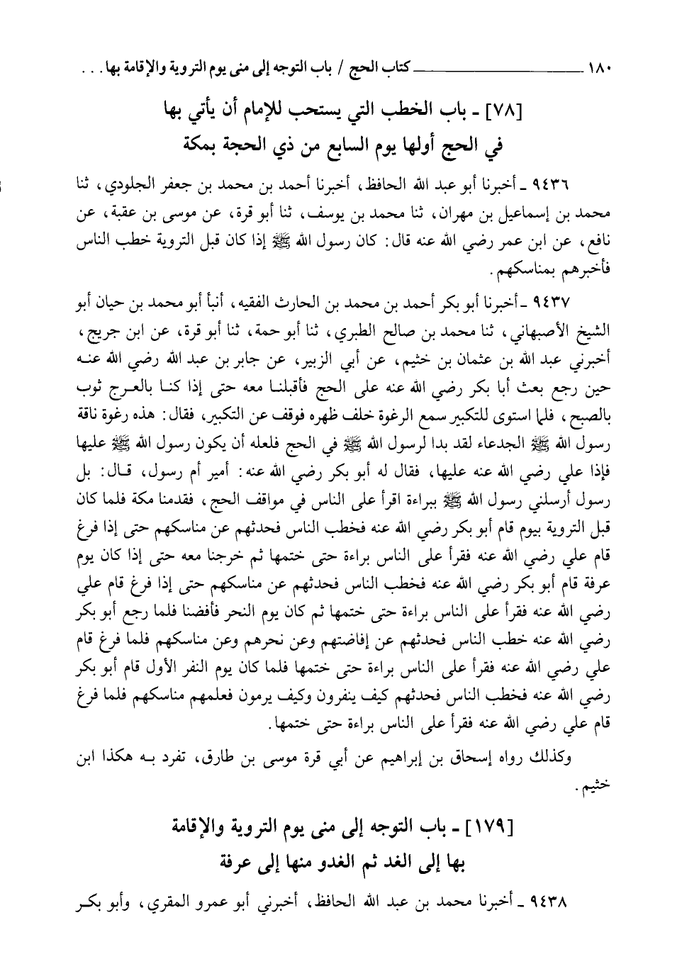 9436 - أَخْبَرَنَا أَبُو عَبْدِ اللهِ الْحَافِظُ , أَخْبَرَنَا أَحْمَدُ بْنُ مُحَمَّدِ بْنِ جَعْفَرٍ الْجُلُودِيُّ , ثنا مُحَمَّدُ بْنُ إِسْمَاعِيلَ بْنِ مِهْرَانَ , ثنا مُحَمَّدُ بْنُ يُوسُفَ , ثنا أَبُو قُرَّةَ , عَنْ مُوسَى بْنِ عُقْبَةَ , عَنْ نَافِعٍ , عَنِ ابْنِ عُمَرَ رَضِيَ اللهُ عَنْهُ , قَالَ: " كَانَ رَسُولُ اللهِ صَلَّى اللهُ عَلَيْهِ وَسَلَّمَ §إِذَا كَانَ قَبْلَ التَّرْوِيَةِ خَطَبَ النَّاسَ , فَأَخْبَرَهُمْ بِمَنَاسِكِهِمْ "