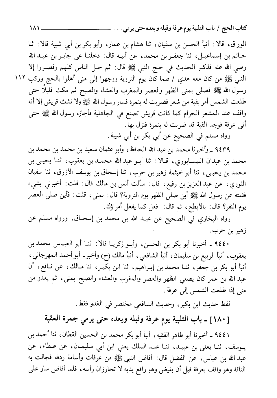9439 - وَأَخْبَرَنَا مُحَمَّدُ بْنُ عَبْدِ اللهِ الْحَافِظُ , وَأَبُو عُثْمَانَ سَعِيدُ بْنُ مُحَمَّدِ بْنِ مُحَمَّدِ بْنِ مُحَمَّدِ بْنِ عَبْدَانَ النَّيْسَابُورِيُّ قَالَا: ثنا أَبُو عَبْدِ اللهِ مُحَمَّدُ بْنُ يَعْقُوبَ , ثنا يَحْيَى بْنُ مُحَمَّدِ بْنِ يَحْيَى , ثنا أَبُو خَيْثَمَةَ زُهَيْرُ بْنُ حَرْبٍ , ثنا إِسْحَاقُ بْنُ يُوسُفَ الْأَزْرَقُ , ثنا سُفْيَانُ الثَّوْرِيُّ , عَنْ عَبْدِ الْعَزِيزِ بْنِ رُفَيْعٍ , قَالَ: سَأَلْتُ أَنَسَ بْنَ مَالِكٍ , قَالَ: قُلْتُ: أَخْبِرْنِي بِشَيْءٍ عَقَلْتَهُ عَنْ رَسُولِ اللهِ صَلَّى اللهُ عَلَيْهِ وَسَلَّمَ §أَيْنَ صَلَّى الظُّهْرَ يَوْمَ التَّرْوِيَةِ؟ قَالَ: " بِمِنًى " , قُلْتُ: فَأَيْنَ صَلَّى الْعَصْرَ يَوْمَ النَّفْرِ؟ قَالَ: " بِالْأَبْطَحِ " ثُمَّ قَالَ: " افْعَلْ كَمَا يَفْعَلُ أُمَرَاؤُكَ " رَوَاهُ الْبُخَارِيُّ فِي الصَّحِيحِ , عَنْ عَبْدِ اللهِ بْنِ مُحَمَّدٍ عَنْ إِسْحَاقَ , وَرَوَاهُ مُسْلِمٌ عَنْ زُهَيْرِ بْنِ حَرْبٍ