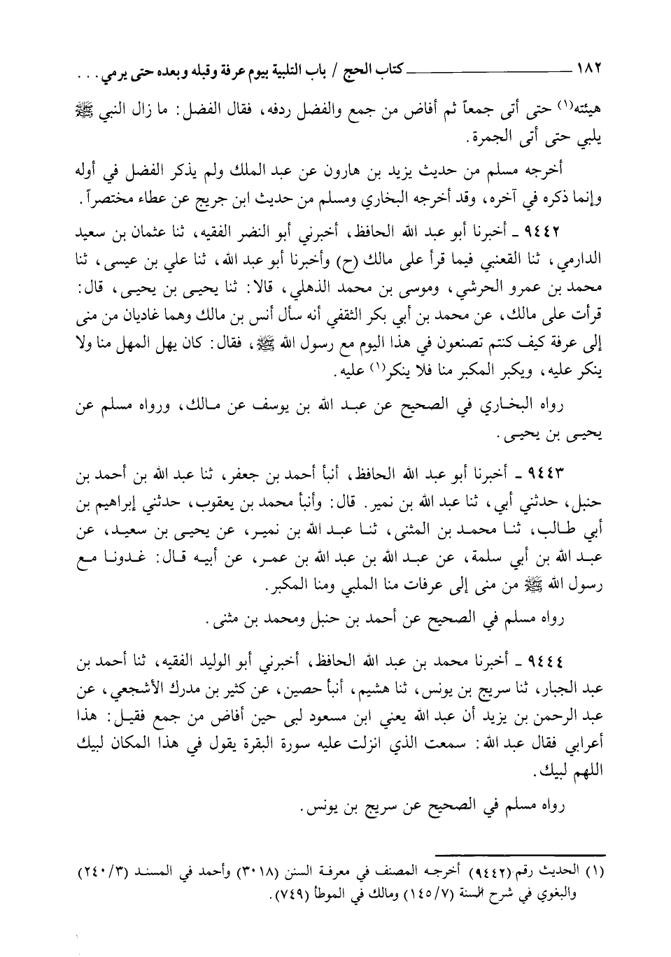 9442 - أَخْبَرَنَا أَبُو عَبْدِ اللهِ الْحَافِظُ , أَخْبَرَنِي أَبُو النَّضْرِ الْفَقِيهُ , ثنا عُثْمَانُ بْنُ سَعِيدٍ الدَّارِمِيُّ , ثنا الْقَعْنَبِيُّ , فِيمَا قَرَأَ عَلَى مَالِكٍ ح وَأَخْبَرَنَا أَبُو عَبْدِ اللهِ , ثنا عَلِيُّ بْنُ عِيسَى , ثنا مُحَمَّدُ بْنُ عَمْرٍو الْحَرَشِيُّ , وَمُوسَى بْنُ مُحَمَّدٍ الذُّهْلِيُّ , قَالَا: ثنا يَحْيَى بْنُ يَحْيَى , قَالَ: قَرَأْتُ عَلَى مَالِكٍ , عَنْ مُحَمَّدِ بْنِ أَبِي بَكْرٍ الثَّقَفِيِّ أَنَّهُ سَأَلَ أَنَسَ بْنَ مَالِكٍ وَهُمَا غَادِيَانِ مِنْ مِنًى إِلَى عَرَفَةَ كَيْفَ كُنْتُمْ تَصْنَعُونَ فِي هَذَا الْيَوْمِ مَعَ رَسُولِ اللهِ صَلَّى اللهُ عَلَيْهِ وَسَلَّمَ؟ فَقَالَ: §" كَانَ يُهِلُّ الْمُهِلُّ مِنَّا وَلَا يُنْكِرُ عَلَيْهِ , وَيُكَبِّرُ الْمُكَبِّرُ مِنَّا فَلَا يُنْكِرُ عَلَيْهِ " , رَوَاهُ الْبُخَارِيُّ فِي الصَّحِيحِ عَنْ عَبْدِ اللهِ بْنِ يُوسُفَ , عَنْ مَالِكٍ , وَرَوَاهُ مُسْلِمٌ عَنْ يَحْيَى بْنِ يَحْيَى