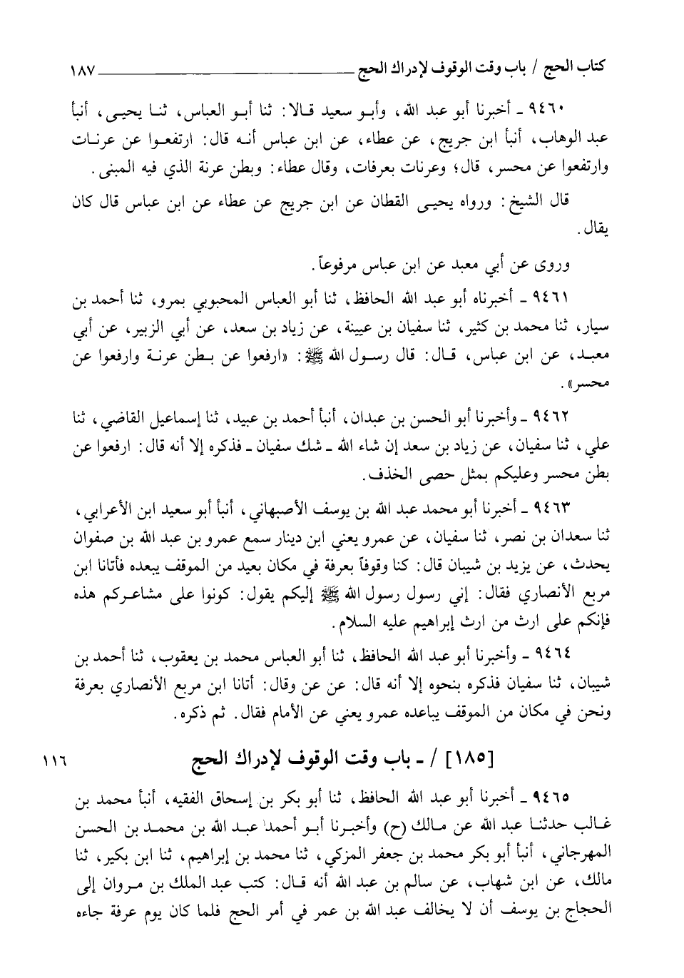 9461 - أَخْبَرَنَاهُ أَبُو عَبْدِ اللهِ الْحَافِظُ , ثنا أَبُو الْعَبَّاسِ الْمَحْبُوبِيُّ , بِمَرْوَ , ثنا أَحْمَدُ بْنُ سَيَّارٍ , ثنا مُحَمَّدُ بْنُ كَثِيرٍ , ثنا سُفْيَانُ بْنُ عُيَيْنَةَ , عَنْ زِيَادِ بْنِ سَعْدٍ , عَنْ أَبِي الزُّبَيْرِ , عَنْ أَبِي مَعْبَدٍ , عَنِ ابْنِ عَبَّاسٍ , قَالَ: قَالَ رَسُولُ اللهِ صَلَّى اللهُ عَلَيْهِ وَسَلَّمَ: §" ارْفَعُوا عَنْ بَطْنِ عُرَنَةَ وَارْفَعُوا عَنْ مُحَسِّرٍ "