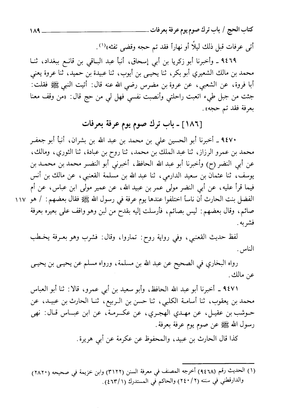 9470 - أَخْبَرَنَا أَبُو الْحُسَيْنِ عَلِيُّ بْنُ مُحَمَّدِ بْنِ عَبْدِ اللهِ بْنِ بِشْرَانَ , أنبأ أَبُو جَعْفَرٍ مُحَمَّدُ بْنُ عَمْرٍو الرَّزَّازُ , ثنا عَبْدُ الْمَلِكِ بْنُ مُحَمَّدٍ , ثنا رَوْحُ بْنُ عُبَادَةَ , ثنا الثَّوْرِيُّ , وَمَالِكٌ , عَنْ أَبِي النَّضْرِ , ح وَأَخْبَرَنَا أَبُو عَبْدِ اللهِ الْحَافِظُ , أَخْبَرَنِي أَبُو النَّضْرِ مُحَمَّدُ بْنُ مُحَمَّدِ بْنِ يُوسُفَ , ثنا عُثْمَانُ بْنُ سَعِيدٍ الدَّارِمِيُّ , ثنا عَبْدُ اللهِ بْنُ مَسْلَمَةَ الْقَعْنَبِيُّ , عَنْ مَالِكِ بْنِ أَنَسٍ , فِيمَا قَرَأَ عَلَيْهِ , عَنْ أَبِي النَّضْرِ مَوْلَى عُمَرَ بْنِ عُبَيْدِ اللهِ , عَنْ عُمَيْرٍ مَوْلَى ابْنِ عَبَّاسٍ , عَنْ أُمِّ الْفَضْلِ بِنْتِ الْحَارِثِ " أَنَّ نَاسًا , اخْتَلَفُوا عِنْدَهَا يَوْمَ عَرَفَةَ فِي رَسُولِ اللهِ صَلَّى اللهُ عَلَيْهِ وَسَلَّمَ , §فَقَالَ بَعْضُهُمْ: هُوَ صَائِمٌ , وَقَالَ بَعْضُهُمْ: لَيْسَ بِصَائِمٍ فَأَرْسَلَتْ إِلَيْهِ بِقَدَحٍ مِنْ لَبَنٍ وَهُوَ وَاقِفٌ عَلَى بَعِيرِهِ بِعَرَفَةَ فَشَرِبَهُ " لَفْظُ حَدِيثِ الْقَعْنَبِيِّ , وَفِي رِوَايَةِ رَوْحٍ: تَمَارَوْا وَقَالَ: فَشَرِبَ وَهُوَ بِعَرَفَةَ يَخْطُبُ النَّاسَ , رَوَاهُ الْبُخَارِيُّ فِي الصَّحِيحِ عَنْ عَبْدِ اللهِ بْنِ مَسْلَمَةَ , وَرَوَاهُ مُسْلِمٌ عَنْ يَحْيَى بْنِ يَحْيَى , عَنْ مَالِكٍ