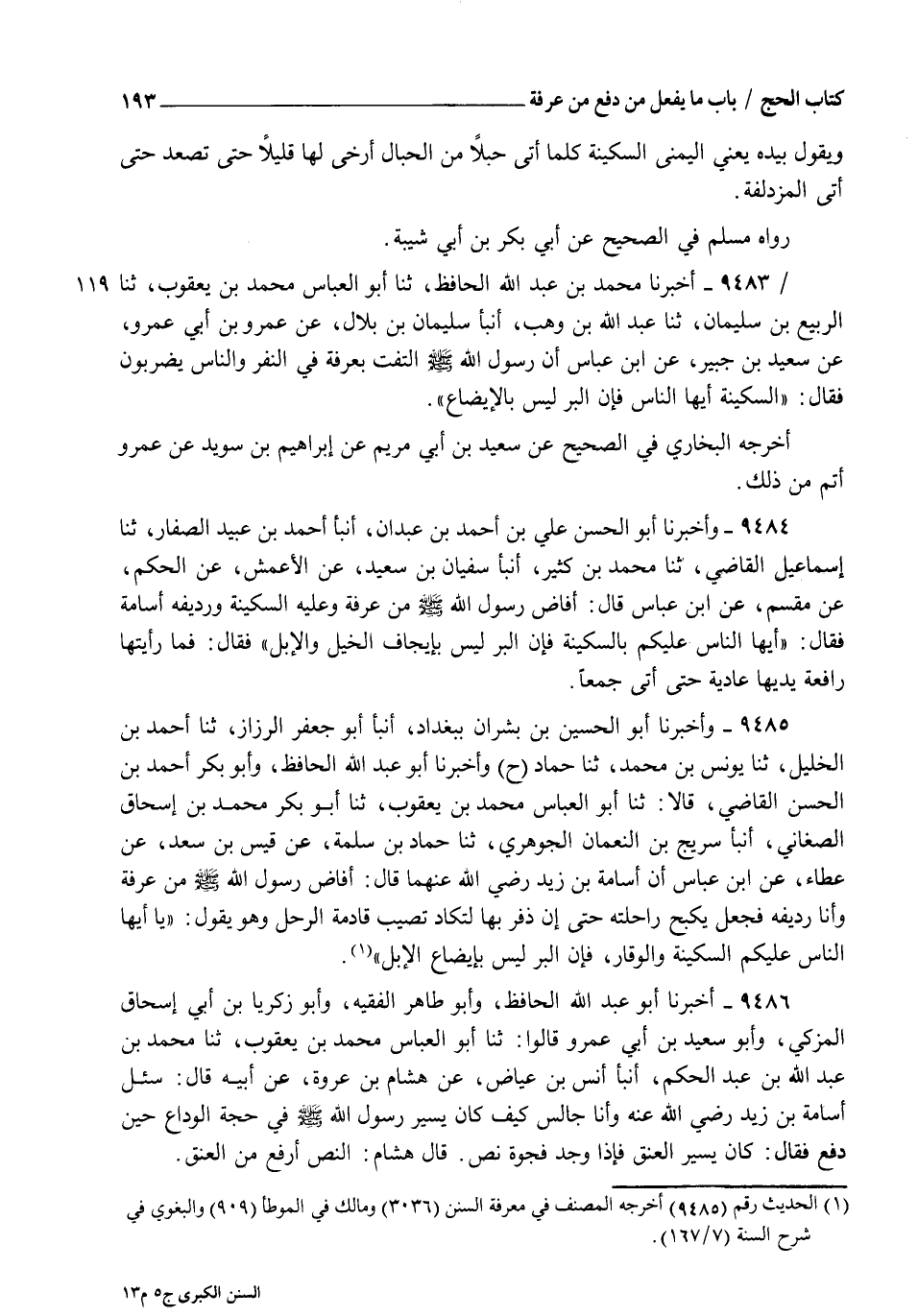 9485 - وَأَخْبَرَنَا أَبُو الْحُسَيْنِ بْنُ بِشْرَانَ , بِبَغْدَادَ , أنبأ أَبُو جَعْفَرٍ الرَّزَّازُ , ثنا أَحْمَدُ بْنُ الْخَلِيلِ , ثنا يُونُسُ بْنُ مُحَمَّدٍ , ثنا حَمَّادٌ , ح وَأَخْبَرَنَا أَبُو عَبْدِ اللهِ الْحَافِظُ , وَأَبُو بَكْرٍ أَحْمَدُ بْنُ الْحَسَنِ الْقَاضِي قَالَا: ثنا أَبُو الْعَبَّاسِ مُحَمَّدُ بْنُ يَعْقُوبَ , ثنا أَبُو بَكْرٍ مُحَمَّدُ بْنُ إِسْحَاقَ الصَّغَانِيُّ , أنبأ سُرَيْجُ بْنُ النُّعْمَانِ الْجَوْهَرِيُّ , ثنا حَمَّادُ بْنُ سَلَمَةَ , عَنْ قَيْسِ بْنِ سَعْدٍ , عَنْ عَطَاءٍ , عَنِ ابْنِ عَبَّاسٍ , أَنَّ أُسَامَةَ بْنَ زَيْدٍ رَضِيَ اللهُ عَنْهُمَا , قَالَ: أَفَاضَ رَسُولُ اللهِ صَلَّى اللهُ عَلَيْهِ وَسَلَّمَ مِنْ عَرَفَةَ وَأَنَا رَدِيفُهُ فَجَعَلَ يَكْبَحُ رَاحِلَتَهُ حَتَّى إِنَّ ذِفْرَيْهَا لَتَكَادُ تُصِيبُ قَادِمَةَ الرَّحْلِ وَهُوَ يَقُولُ: " يَا أَيُّهَا النَّاسُ §عَلَيْكُمُ السَّكِينَةَ وَالْوَقَارَ فَإِنَّ الْبِرَّ لَيْسَ بِإِيضَاعِ الْإِبِلِ "