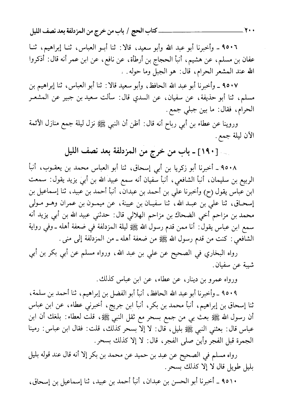 9509 - وَأَخْبَرَنَا أَبُو عَبْدِ اللهِ الْحَافِظُ , أنبأ أَبُو الْفَضْلِ بْنُ إِبْرَاهِيمَ , ثنا أَحْمَدُ بْنُ سَلَمَةَ , ثنا إِسْحَاقُ بْنُ إِبْرَاهِيمَ , أنبأ مُحَمَّدُ بْنُ بَكْرٍ , أنبأ ابْنُ جُرَيْجٍ , أَخْبَرَنِي عَطَاءٌ , عَنِ ابْنِ عَبَّاسٍ §" أَنَّ رَسُولَ اللهِ صَلَّى اللهُ عَلَيْهِ وَسَلَّمَ بَعَثَ بِي مِنْ جَمْعٍ بِسَحَرٍ مَعَ ثَقَلِ النَّبِيِّ صَلَّى اللهُ عَلَيْهِ وَسَلَّمَ " قُلْتُ لِعَطَاءٍ: بَلَغَكَ أَنَّ ابْنَ عَبَّاسٍ , قَالَ: " بَعَثَنِي النَّبِيُّ صَلَّى اللهُ عَلَيْهِ وَسَلَّمَ بِلَيْلٍ؟ " قَالَ: لَا إِلَّا بِسَحَرٍ كَذَلِكَ قُلْتُ , فَقَالَ ابْنُ عَبَّاسٍ: " رَمَيْنَا الْجَمْرَةَ قَبْلَ الْفَجْرِ , وَأَيْنَ صَلَّى الْفَجْرَ؟ " , قَالَ: " لَا إِلَّا كَذَلِكَ بِسَحَرٍ " , رَوَاهُ مُسْلِمٌ فِي الصَّحِيحِ عَنْ عَبْدِ بْنِ حُمَيْدٍ , عَنْ مُحَمَّدِ بْنِ بَكْرٍ إِلَّا أَنَّهُ قَالَ عِنْدَ قَوْلِهِ " بِلَيْلٍ ": " بِلَيْلٍ طَوِيلٍ " , قَالَ: " لَا إِلَّا كَذَلِكَ بِسَحَرٍ "