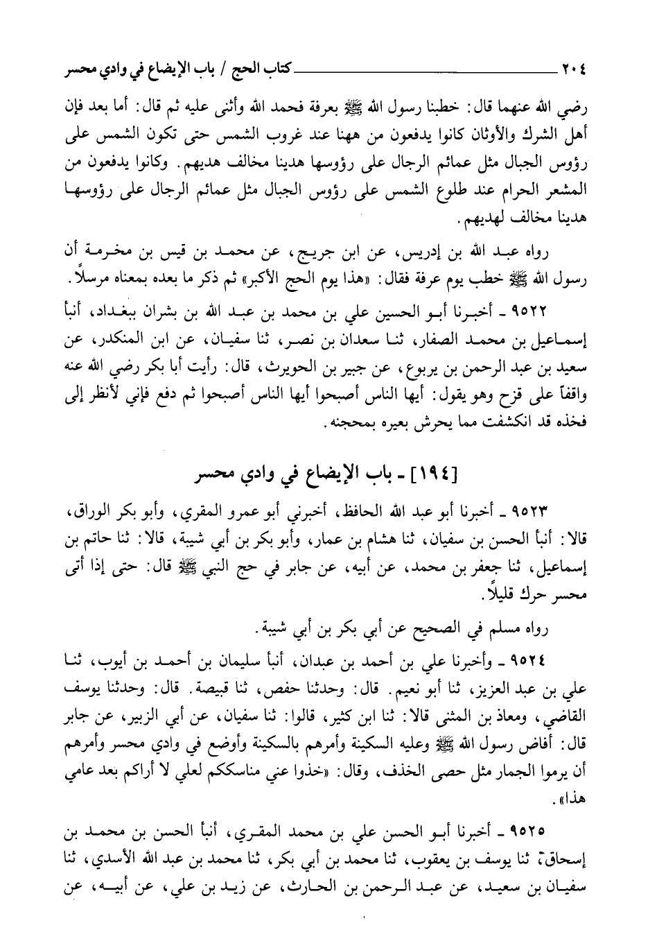 9523 - أَخْبَرَنَا أَبُو عَبْدِ اللهِ الْحَافِظُ , أَخْبَرَنِي أَبُو عَمْرٍو الْمُقْرِئُ , وَأَبُو بَكْرٍ الْوَرَّاقُ قَالَا: أنبأ الْحَسَنُ بْنُ سُفْيَانَ , ثنا هِشَامُ بْنُ عَمَّارٍ , وَأَبُو بَكْرِ بْنُ أَبِي شَيْبَةَ قَالَا: ثنا حَاتِمُ بْنُ إِسْمَاعِيلَ , ثنا جَعْفَرُ بْنُ مُحَمَّدٍ , عَنْ أَبِيهِ , عَنْ جَابِرٍ فِي حَجِّ النَّبِيِّ صَلَّى اللهُ عَلَيْهِ وَسَلَّمَ , قَالَ: §" حَتَّى إِذَا أَتَى مُحَسِّرًا حَرَّكَ قَلِيلًا " , رَوَاهُ مُسْلِمٌ فِي الصَّحِيحِ عَنْ أَبِي بَكْرِ بْنِ أَبِي شَيْبَةَ