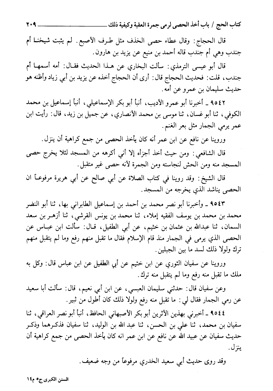 9544 - أَخْبَرَنِي بِهَذَيْنِ الْأَثَرَيْنِ أَبُو بَكْرٍ الْأَصْبَهَانِيُّ الْحَافِظُ , أنبأ أَبُو نَصْرٍ الْعِرَاقِيُّ , ثنا سُفْيَانُ بْنُ مُحَمَّدٍ , ثنا عَلِيُّ بْنُ الْحَسَنِ , ثنا عَبْدُ اللهِ بْنُ الْوَلِيدِ , ثنا سُفْيَانُ , فَذَكَرَهُمَا , وَذَكَرَ حَدِيثَ سُفْيَانَ , عَنْ عُبَيْدِ اللهِ , عَنْ نَافِعٍ , عَنِ ابْنِ عُمَرَ §" أَنَّهُ كَانَ يَأْخُذُ الْحَصَى مِنْ جَمْعٍ كَرَاهِيَةَ أَنْ يَنْزِلَ " , وَقَدْ رُوِيَ حَدِيثُ أَبِي سَعِيدٍ الْخُدْرِيِّ مَرْفُوعًا مِنْ وَجْهٍ ضَعِيفٍ