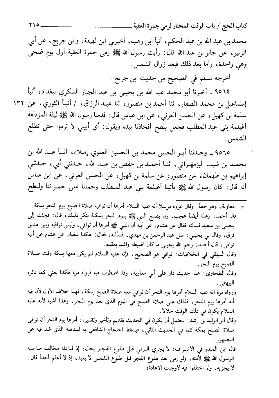 9565 - وَحَدَّثَنَا أَبُو الْحَسَنِ مُحَمَّدُ بْنُ الْحُسَيْنِ الْعَلَوِيُّ إِمْلَاءً , أنبأ عَبْدُ اللهِ بْنُ مُحَمَّدِ بْنِ شُعَيْبٍ الْبَزْمِهْرَانِيُّ , ثنا أَحْمَدُ بْنُ حَفْصِ بْنِ عَبْدِ اللهِ , حَدَّثَنِي أَبِي , حَدَّثَنِي إِبْرَاهِيمُ بْنُ طَهْمَانَ , عَنْ مَنْصُورٍ , عَنْ سَلَمَةَ بْنِ كُهَيْلٍ , عَنِ الْحَسَنِ الْعُرَنِيِّ , عَنِ ابْنِ عَبَّاسٍ أَنَّهُ قَالَ: " كَانَ رَسُولُ اللهِ صَلَّى اللهُ عَلَيْهِ وَسَلَّمَ يَأْتِينَا أُغَيْلِمَةَ بَنِي عَبْدِ الْمُطَّلِبِ , وَحَمَلَنَا عَلَى حُمُرَاتِنَا وَلَطَحَ -[216]- أَفْخَاذَنَا ثُمَّ قَالَ: §" لَا تَرْمُوا الْجَمْرَةَ حَتَّى تَطْلُعَ الشَّمْسُ , وَلَا أَظُنُّ أَحَدًا يَرْمِيهَا حَتَّى تَطْلُعَ الشَّمْسُ "