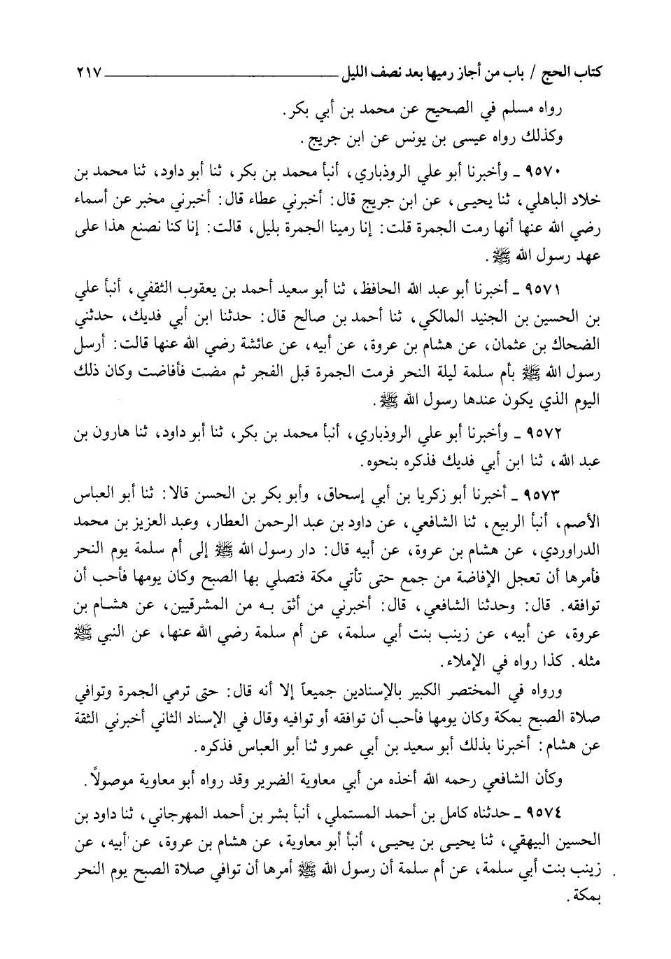 9571 - أَخْبَرَنَا أَبُو عَبْدِ اللهِ الْحَافِظُ , ثنا أَبُو سَعِيدٍ أَحْمَدُ بْنُ يَعْقُوبَ الثَّقَفِيُّ , أنبأ عَلِيُّ بْنُ الْحُسَيْنِ بْنِ الْجُنَيْدِ الْمَالِكِيُّ , ثنا أَحْمَدُ بْنُ صَالِحٍ , قَالَ: حَدَّثَنَا ابْنُ أَبِي فُدَيْكٍ , حَدَّثَنِي الضَّحَّاكُ بْنُ عُثْمَانَ , عَنْ هِشَامِ بْنِ عُرْوَةَ , عَنْ أَبِيهِ , عَنْ عَائِشَةَ رَضِيَ اللهُ عَنْهَا , قَالَتْ: " أَرْسَلَ رَسُولُ اللهِ صَلَّى اللهُ عَلَيْهِ وَسَلَّمَ بِأُمِّ سَلَمَةَ لَيْلَةَ النَّحْرِ §فَرَمَتِ الْجَمْرَةَ قَبْلَ الْفَجْرِ ثُمَّ مَضَتْ فَأَفَاضَتْ , وَكَانَ ذَلِكَ الْيَوْمُ الَّذِي يَكُونُ عِنْدَهَا رَسُولُ اللهِ صَلَّى اللهُ عَلَيْهِ وَسَلَّمَ "