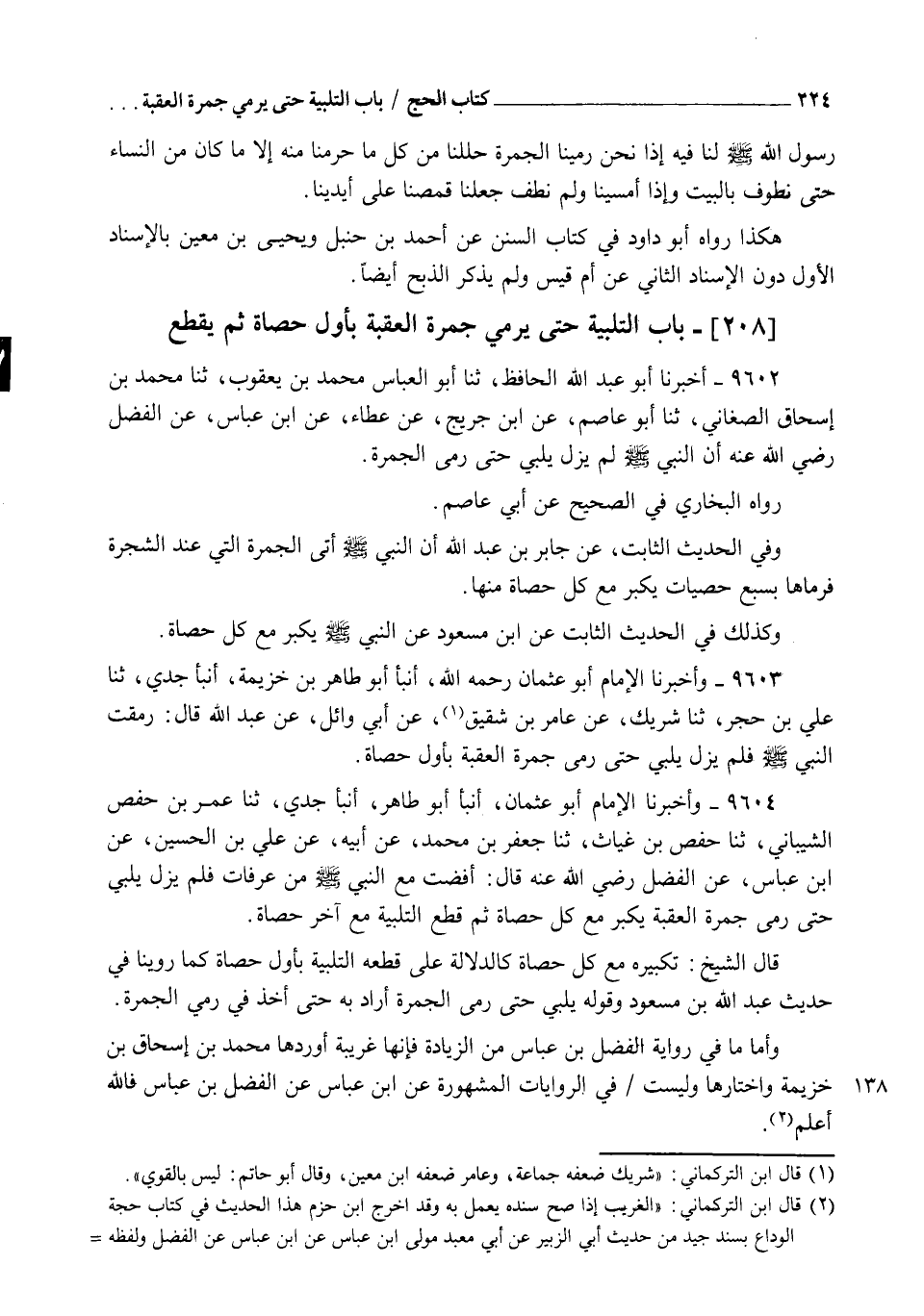 9602 - أَخْبَرَنَا أَبُو عَبْدِ اللهِ الْحَافِظُ , ثنا أَبُو الْعَبَّاسِ مُحَمَّدُ بْنُ يَعْقُوبَ , ثنا مُحَمَّدُ بْنُ إِسْحَاقَ الصَّغَانِيُّ , ثنا أَبُو عَاصِمٍ , عَنِ ابْنِ جُرَيْجٍ , عَنْ عَطَاءٍ , عَنِ ابْنِ عَبَّاسٍ , عَنِ الْفَضْلِ رَضِيَ اللهُ عَنْهُ " أَنَّ النَّبِيَّ صَلَّى اللهُ عَلَيْهِ وَسَلَّمَ §لَمْ يَزَلْ يُلَبِّي حَتَّى رَمَى الْجَمْرَةَ " رَوَاهُ الْبُخَارِيُّ فِي الصَّحِيحِ عَنْ أَبِي عَاصِمٍ وَفِي الْحَدِيثِ الثَّابِتِ عَنْ جَابِرِ بْنِ عَبْدِ اللهِ أَنَّ النَّبِيَّ صَلَّى اللهُ عَلَيْهِ وَسَلَّمَ أَتَى الْجَمْرَةَ الَّتِي عِنْدَ الشَّجَرَةِ فَرَمَاهَا بِسَبْعِ حَصَيَاتٍ يُكَبِّرُ مَعَ كُلِّ حَصَاةٍ مِنْهَا , وَكَذَلِكَ فِي الْحَدِيثِ الثَّابِتِ , عَنِ ابْنِ مَسْعُودٍ , عَنِ النَّبِيِّ صَلَّى اللهُ عَلَيْهِ وَسَلَّمَ يُكَبِّرُ مَعَ كُلِّ حَصَاةٍ