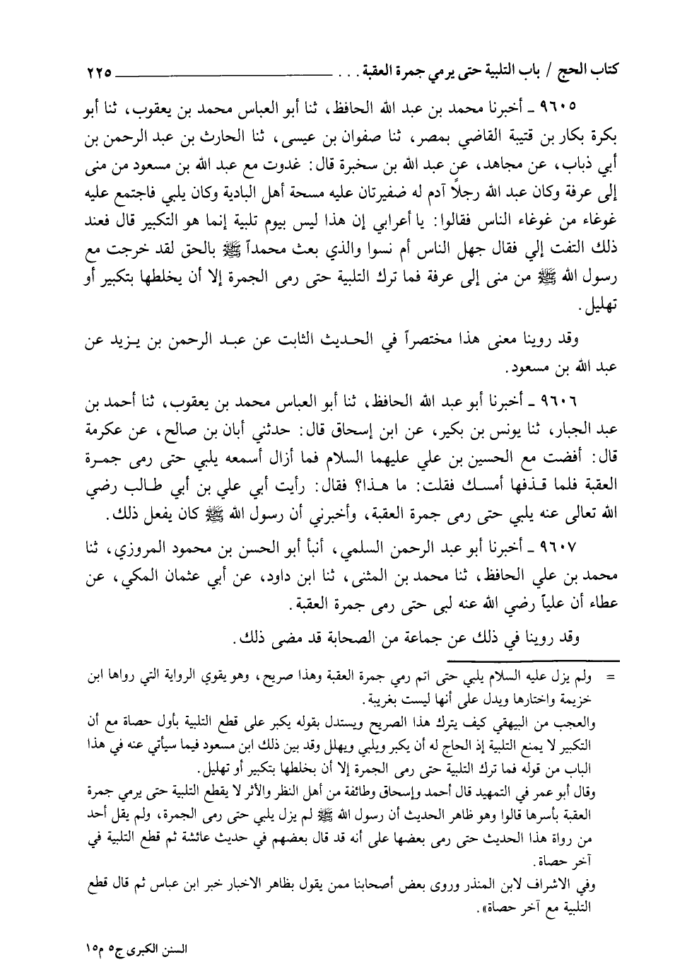 9605 - أَخْبَرَنَا مُحَمَّدُ بْنُ عَبْدِ اللهِ الْحَافِظُ , ثنا أَبُو الْعَبَّاسِ مُحَمَّدُ بْنُ يَعْقُوبَ , ثنا أَبُو بَكْرَةَ بَكَّارُ بْنُ قُتَيْبَةَ الْقَاضِي بِمِصْرَ , ثنا صَفْوَانُ بْنُ عِيسَى , ثنا الْحَارِثُ بْنُ عَبْدِ الرَّحْمَنِ بْنِ أَبِي ذُبَابٍ , عَنْ مُجَاهِدٍ , عَنْ عَبْدِ اللهِ بْنِ سَخْبَرَةَ , قَالَ: غَدَوْتُ مَعَ عَبْدِ اللهِ بْنِ مَسْعُودٍ مِنْ مِنًى إِلَى عَرَفَةَ وَكَانَ عَبْدُ اللهِ رَجُلًا آدَمَ لَهُ ضَفِيرَتَانِ عَلَيْهِ مِسْحَةُ أَهْلِ الْبَادِيَةِ , وَكَانَ يُلَبِّي فَاجْتَمَعَ عَلَيْهِ غَوْغَاءُ مِنْ غَوْغَاءِ النَّاسِ فَقَالُوا: يَا أَعْرَابِيُّ إِنَّ هَذَا لَيْسَ بِيَوْمِ تَلْبِيَةٍ إِنَّمَا هُوَ التَّكْبِيرُ , قَالَ: فَعِنْدَ ذَلِكَ الْتَفَتَ إِلِيَّ , فَقَالَ: " جَهِلَ النَّاسُ أَمْ نَسُوا؟ وَالَّذِي بَعَثَ مُحَمَّدًا صَلَّى اللهُ عَلَيْهِ وَسَلَّمَ بِالْحَقِّ لَقَدْ خَرَجْتُ مَعَ رَسُولِ اللهِ صَلَّى اللهُ عَلَيْهِ وَسَلَّمَ مِنْ مِنًى إِلَى عَرَفَةَ §فَمَا تَرَكَ التَّلْبِيَةَ حَتَّى رَمَى الْجَمْرَةَ إِلَّا أَنْ يَخْلِطَهَا بِتَكْبِيرٍ أَوْ تَهْلِيلٍ " وَقَدْ رُوِّينَا مَعْنَى هَذَا مُخْتَصَرًا فِي الْحَدِيثِ الثَّابِتِ عَنْ عَبْدِ الرَّحْمَنِ بْنِ يَزِيدَ , عَنْ عَبْدِ اللهِ بْنِ مَسْعُودٍ