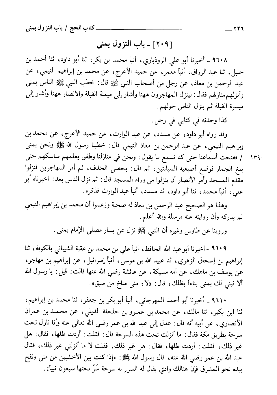 9608 - أَخْبَرَنَا أَبُو عَلِيٍّ الرُّوذْبَارِيُّ , أنبأ مُحَمَّدُ بْنُ بَكْرٍ , ثنا أَبُو دَاوُدَ , ثنا أَحْمَدُ بْنُ حَنْبَلٍ , ثنا عَبْدُ الرَّزَّاقِ , أنبأ مَعْمَرٌ , عَنْ حُمَيْدٍ الْأَعْرَجِ , عَنْ مُحَمَّدِ بْنِ إِبْرَاهِيمَ التَّيْمِيِّ , عَنْ عَبْدِ الرَّحْمَنِ بْنِ مُعَاذٍ , عَنْ رَجُلٍ مِنْ أَصْحَابِ النَّبِيِّ صَلَّى اللهُ عَلَيْهِ وَسَلَّمَ , قَالَ: خَطَبَ النَّبِيُّ صَلَّى اللهُ عَلَيْهِ وَسَلَّمَ النَّاسَ بِمِنًى وَأَنْزَلَهُمْ مَنَازِلَهُمْ , فَقَالَ: §" لِيَنْزِلِ الْمُهَاجِرُونَ هَا هُنَا " وَأَشَارَ إِلَى مَيْمَنَةِ الْقِبْلَةِ " وَالْأَنْصَارُ هَا هُنَا " وَأَشَارَ إِلَى مَيْسَرَةِ الْقِبْلَةِ " ثُمَّ يَنْزِلُ النَّاسُ حَوْلَهُمْ " كَذَا وَجَدْتُهُ فِي كِتَابِي عَنْ رَجُلٍ , وَقَدْ رَوَاهُ أَبُو دَاوُدَ , عَنْ مُسَدَّدٍ , عَنْ عَبْدِ الْوَارِثِ , عَنْ حُمَيْدٍ الْأَعْرَجِ , عَنْ مُحَمَّدِ بْنِ إِبْرَاهِيمَ التَّيْمِيِّ , عَنْ عَبْدِ الرَّحْمَنِ بْنِ مُعَاذٍ التَّيْمِيِّ , قَالَ: خَطَبَنَا رَسُولُ اللهِ صَلَّى اللهُ عَلَيْهِ وَسَلَّمَ وَنَحْنُ بِمِنًى فَفُتِحَتْ أَسْمَاعُنَا حَتَّى كُنَّا نَسْمَعُ مَا يَقُولُ , وَنَحْنُ فِي مَنَازِلِنَا وَطَفِقَ يُعَلِّمُهُمْ مَنَاسِكَهُمْ حَتَّى بَلَغَ الْجِمَارَ فَوَضَعَ أُصْبُعَيْهِ السَّبَّابَتَيْنِ ثُمَّ قَالَ: " بِحَصَى الْخَذْفِ " ثُمَّ أَمَرَ الْمُهَاجِرِينَ فَنَزَلُوا مُقَدَّمَ الْمَسْجِدِ وَأَمَرَ الْأَنْصَارَ أَنْ يَنْزِلُوا مِنْ وَرَاءِ الْمَسْجِدِ , قَالَ: ثُمَّ نَزَلَ النَّاسُ بَعْدُ , أَخْبَرَنَاهُ أَبُو عَلِيٍّ , أَنْبَأَ مُحَمَّدٌ , ثنا أَبُو دَاوُدَ , ثنا مُسَدَّدٌ , أَنْبَأَ عَبْدُ الْوَارِثِ فَذَكَرَهُ. وَهَذَا هُوَ الصَّحِيحُ , عَبْدُ الرَّحْمَنِ بْنُ مُعَاذٍ لَهُ صُحْبَةٌ وَزَعَمُوا أَنَّ مُحَمَّدَ بْنَ إِبْرَاهِيمَ التَّيْمِيَّ لَمْ يُدْرِكْهُ , وَأَنَّ رِوَايَتَهُ عَنْهُ مُرْسَلَةٌ وَاللهُ أَعْلَمُ , وَرُوِّينَا عَنْ طَاوُسٍ وَغَيْرِهِ أَنَّ النَّبِيَّ صَلَّى اللهُ عَلَيْهِ وَسَلَّمَ نَزَلَ عَلَى يَسَارِ مُصَلَّى الْإِمَامِ بِمِنًى