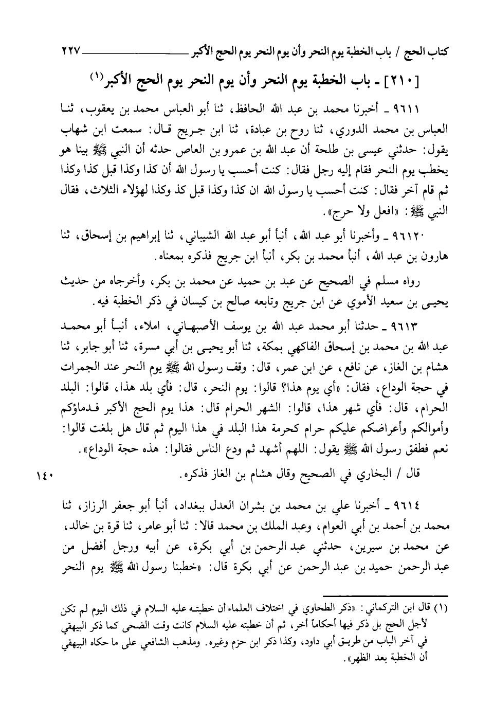 9613 - حَدَّثَنَا أَبُو مُحَمَّدٍ عَبْدُ اللهِ بْنُ يُوسُفَ الْأَصْبَهَانِيُّ إِمْلَاءً , أنبأ أَبُو مُحَمَّدٍ عَبْدُ اللهِ بْنُ مُحَمَّدِ بْنِ إِسْحَاقَ الْفَاكِهِيُّ بِمَكَّةَ , ثنا أَبُو يَحْيَى بْنُ أَبِي مَسَرَّةَ , ثنا أَبُو جَابِرٍ , ثنا هِشَامُ بْنُ الْغَازِ , عَنْ نَافِعٍ , عَنِ ابْنِ عُمَرَ , قَالَ: وَقَفَ رَسُولُ اللهِ صَلَّى اللهُ عَلَيْهِ وَسَلَّمَ يَوْمَ النَّحْرِ عِنْدَ الْجَمَرَاتِ فِي حَجَّةِ الْوَدَاعِ , فَقَالَ: " §أِيُّ يَوْمٍ هَذَا؟ " قَالُوا: يَوْمُ النَّحْرِ , قَالَ: " فَأِيُّ بَلَدٍ هَذَا؟ " قَالُوا: الْبَلَدُ الْحَرَامُ , قَالَ: " فَأِيُّ شَهْرٍ هَذَا؟ " قَالُوا: الشَّهْرُ الْحَرَامُ , قَالَ: " هَذَا يَوْمُ الْحَجِّ الْأَكْبَرِ فَدِمَاؤُكُمْ , وَأَمْوَالُكُمْ , وَأَعْرَاضُكُمْ عَلَيْكُمْ حَرَامٌ كَحُرْمَةِ هَذَا الْبَلَدِ فِي هَذَا الْيَوْمِ " , ثُمَّ قَالَ: " هَلْ بَلَّغْتُ؟ " قَالُوا: نَعَمْ فَطَفِقَ رَسُولُ اللهِ صَلَّى اللهُ عَلَيْهِ وَسَلَّمَ , يَقُولُ: " اللهُمَّ اشْهَدْ " ثُمَّ وَدَّعَ النَّاسَ فَقَالُوا هَذِهِ حَجَّةُ الْوَدَاعِ قَالَ الْبُخَارِيُّ فِي الصَّحِيحِ: وَقَالَ هِشَامُ بْنُ الْغَازِ فَذَكَرَهُ
