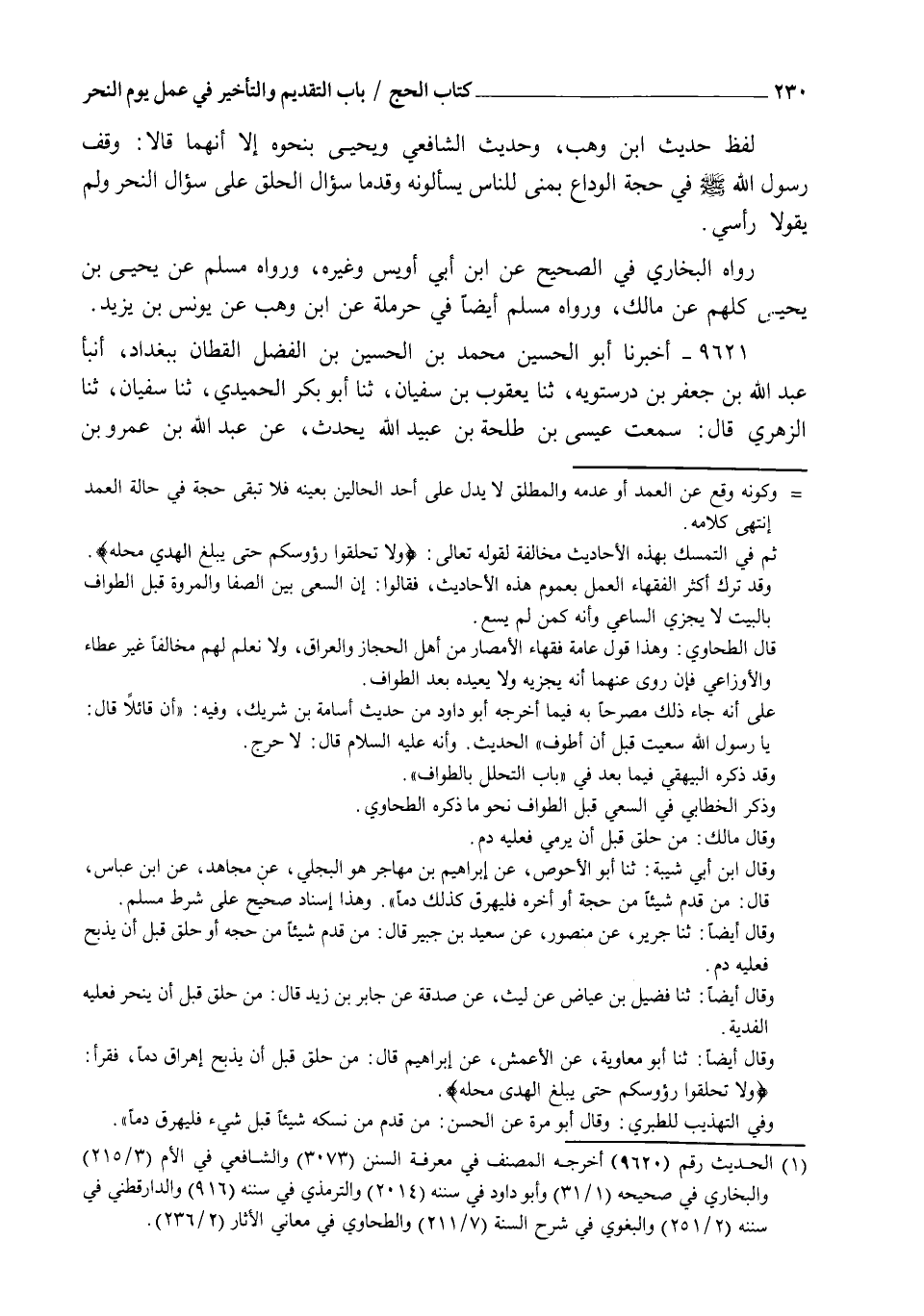 9621 - أَخْبَرَنَا أَبُو الْحُسَيْنِ مُحَمَّدُ بْنُ الْحُسَيْنِ بْنِ الْفَضْلِ الْقَطَّانُ بِبَغْدَادَ , أنبأ عَبْدُ اللهِ بْنُ جَعْفَرِ بْنِ دَرَسْتَوَيْهِ , ثنا يَعْقُوبُ بْنُ سُفْيَانَ , ثنا أَبُو بَكْرٍ الْحُمَيْدِيُّ , ثنا سُفْيَانُ , ثنا الزُّهْرِيُّ , قَالَ: سَمِعْتُ عِيسَى بْنَ طَلْحَةَ بْنِ عُبَيْدِ اللهِ , يُحَدِّثُ عَنْ عَبْدِ اللهِ بْنِ عَمْرِو بْنِ -[231]- الْعَاصِ أَنَّ رَجُلًا سَأَلَ النَّبِيَّ صَلَّى اللهُ عَلَيْهِ وَسَلَّمَ , فَقَالَ: يَا رَسُولَ اللهِ , ذَبَحْتُ قَبْلَ أَنْ أَرْمِيَ , قَالَ: " §ارْمِ وَلَا حَرَجَ " قَالَ آخَرُ: حَلَقْتُ قَبْلَ أَنْ أَذْبَحَ , قَالَ: " اذْبَحْ وَلَا حَرَجَ " قَالَ أَبُو بَكْرٍ: ثُمَّ سَمِعْتُ سُفْيَانَ يُسْأَلُ عَنْ هَذَا الْحَدِيثِ , فَقَالَ لَهُ بُلْبُلٌ: هَذَا مِمَّا حَفِظْتَ مِنَ الزُّهْرِيِّ يَا أَبَا مُحَمَّدٍ؟ قَالَ: نَعَمْ كَأَنَّكَ تَسْمَعْهُ إِلَّا أَنَّهُ كَانَ يُطِيلُهُ فَهَذَا الَّذِي حَفِظْتُ مِنْهُ , قَالَ: وَسَمِعْتُ بُلْبُلًا قَالَ لِسُفْيَانَ: إِنَّ عَبْدَ الرَّحْمَنِ بْنَ مَهْدِيٍّ قَالَ: إِنَّكَ قُلْتَ لَهُ: لَمْ أَحْفَظْهُ، فَقَالَ سُفْيَانُ: صَدَقَ ابْنُ مَهْدِيٍّ لَمْ أَحْفَظْهُ بِطُولِهِ فَأَمَّا هَذَا فَقَدْ أَتْقَنْتُهُ , رَوَاهُ مُسْلِمٌ فِي الصَّحِيحِ عَنْ أَبِي بَكْرِ بْنِ أَبِي شَيْبَةَ وَغَيْرِهِ , عَنْ سُفْيَانَ دُونَ قِصَّةِ بُلْبُلٍ , وَرَوَاهُ عَنِ ابْنِ أَبِي عُمَرَ وَعَبْدُ بْنُ حُمَيْدٍ، عَنْ عَبْدِ الرَّزَّاقِ، عَنْ مَعْمَرٍ، عَنِ الزُّهْرِيِّ وَأَحَالَ بِمَتْنِهِ عَلَى رِوَايَةِ ابْنِ عُيَيْنَةَ سِوَى مَا اسْتَثْنَاهُ، وَفِي حَدِيثِ عَبْدِ الرَّزَّاقِ زِيَادَةٌ أُخْرَى لَيْسَتْ فِي رِوَايَةِ ابْنِ عُيَيْنَةَ