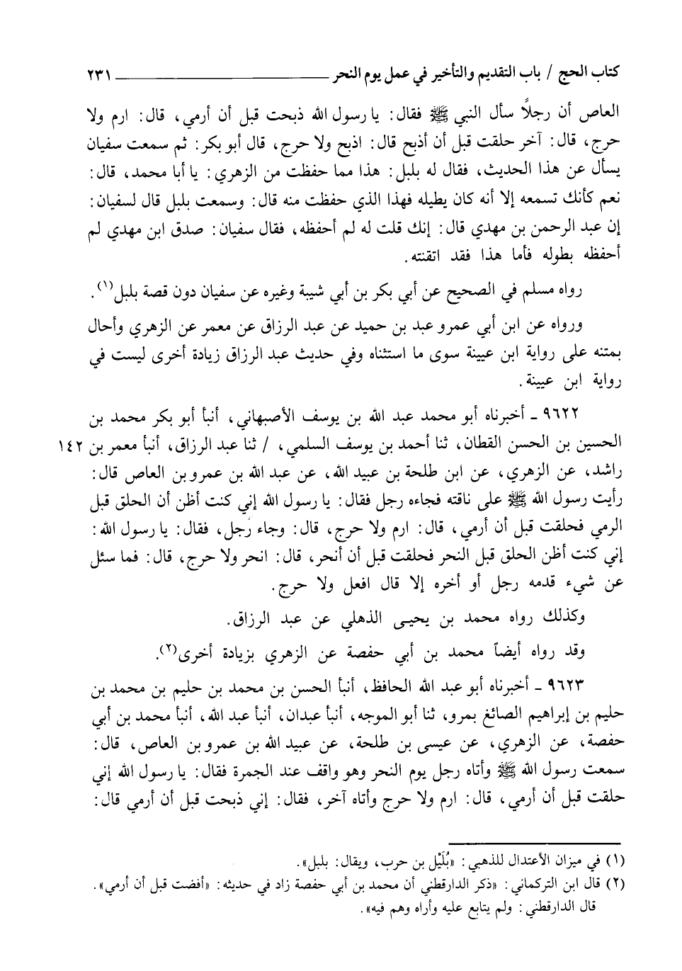 9622 - أَخْبَرَنَاهُ أَبُو مُحَمَّدٍ عَبْدُ اللهِ بْنُ يُوسُفَ الْأَصْبَهَانِيُّ , أنبأ أَبُو بَكْرٍ مُحَمَّدُ بْنُ الْحُسَيْنِ بْنِ الْحَسَنِ الْقَطَّانُ , ثنا أَحْمَدُ بْنُ يُوسُفَ السُّلَمِيُّ , ثنا عَبْدُ الرَّزَّاقِ , أنبأ مَعْمَرُ بْنُ رَاشِدٍ , عَنِ الزُّهْرِيِّ , عَنِ ابْنِ طَلْحَةَ بْنِ عُبَيْدِ اللهِ , عَنْ عَبْدِ اللهِ بْنِ عَمْرِو بْنِ الْعَاصِ , قَالَ: رَأَيْتُ رَسُولَ اللهِ صَلَّى اللهُ عَلَيْهِ وَسَلَّمَ عَلَى نَاقَتِهِ فَجَاءَهُ رَجُلٌ , فَقَالَ: يَا رَسُولَ اللهِ , إِنِّي كُنْتُ أَظُنُّ أَنَّ الْحَلْقَ قَبْلَ الرَّمْيِ , فَحَلَقْتُ قَبْلَ أَنْ أَرْمِيَ , قَالَ: " §ارْمِ وَلَا حَرَجَ " قَالَ: وَجَاءَ رَجُلٌ , فَقَالَ: يَا رَسُولَ اللهِ إِنِّي كُنْتُ أَظُنُّ الْحَلْقَ قَبْلَ النَّحْرِ , فَحَلَقْتُ قَبْلَ أَنْ أَنْحَرَ , قَالَ: " انْحَرْ وَلَا حَرَجَ " قَالَ: فَمَا سُئِلَ عَنْ شَيْءٍ قَدَّمَهُ رَجُلٌ أَوْ أَخَّرَهُ إِلَّا قَالَ: " افْعَلْ وَلَا حَرَجَ " وَكَذَلِكَ رَوَاهُ مُحَمَّدُ بْنُ يَحْيَى الذُّهْلِيُّ , عَنْ عَبْدِ الرَّزَّاقِ وَقَدْ رَوَاهُ أَيْضًا مُحَمَّدُ بْنُ أَبِي حَفْصَةَ , عَنِ الزُّهْرِيِّ بِزِيَادَةٍ أُخْرَى