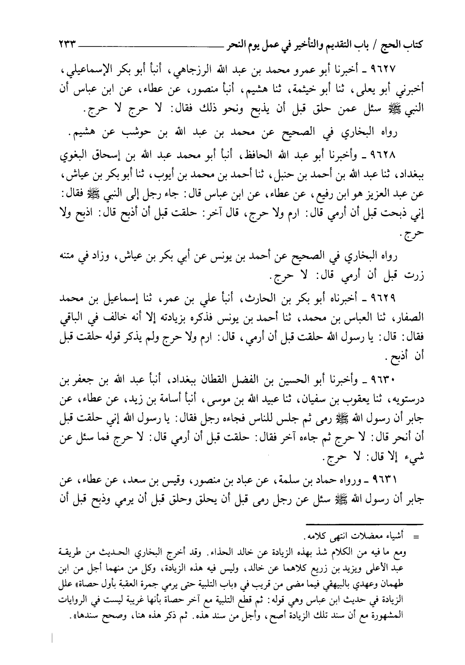 9627 - أَخْبَرَنَا أَبُو عَمْرٍو مُحَمَّدُ بْنُ عَبْدِ اللهِ الرَّزْجَاهِيُّ , أنبأ أَبُو بَكْرٍ الْإِسْمَاعِيلِيُّ , أَخْبَرَنِي أَبُو يَعْلَى , ثنا أَبُو خَيْثَمَةَ , ثنا هُشَيْمٌ , أنبأ مَنْصُورٌ , عَنْ عَطَاءٍ , عَنِ ابْنِ عَبَّاسٍ أَنَّ النَّبِيَّ صَلَّى اللهُ عَلَيْهِ وَسَلَّمَ سُئِلَ عَمَّنْ حَلَقَ قَبْلَ أَنْ يَذْبَحَ وَنَحْوَ ذَلِكَ , فَقَالَ: §لَا حَرَجَ لَا حَرَجَ , رَوَاهُ الْبُخَارِيُّ فِي الصَّحِيحِ عَنْ مُحَمَّدِ بْنِ عَبْدِ اللهِ بْنِ حَوْشَبٍ , عَنْ هُشَيْمٍ