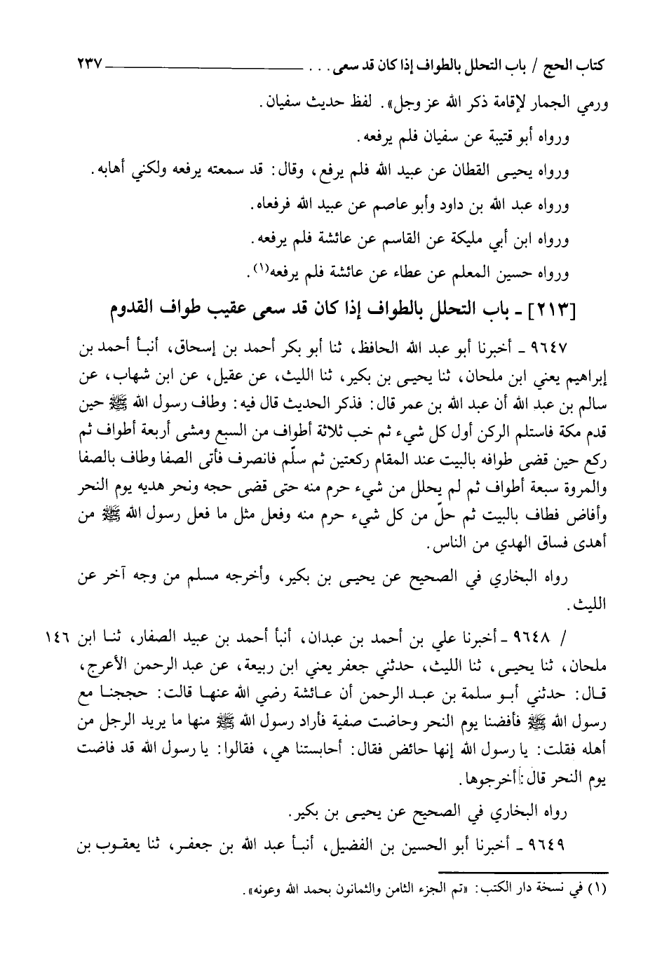 9648 - أَخْبَرَنَا عَلِيُّ بْنُ أَحْمَدَ بْنِ عَبْدَانَ , أنبأ أَحْمَدُ بْنُ عُبَيْدٍ الصَّفَّارُ , ثنا ابْنُ مِلْحَانَ، ثنا يَحْيَى، ثنا اللَّيْثُ , حَدَّثَنِي جَعْفَرٌ يَعْنِي ابْنَ رَبِيعَةَ , عَنْ عَبْدِ الرَّحْمَنِ الْأَعْرَجِ , قَالَ: حَدَّثَنِي أَبُو سَلَمَةَ بْنُ عَبْدِ الرَّحْمَنِ أَنَّ عَائِشَةَ رَضِيَ اللهُ عَنْهَا , قَالَتْ: حَجَجْنَا مَعَ رَسُولِ اللهِ صَلَّى اللهُ عَلَيْهِ وَسَلَّمَ فَأَفَضْنَا يَوْمَ النَّحْرِ وَحَاضَتْ صَفِيَّةُ فَأَرَادَ رَسُولُ اللهِ صَلَّى اللهُ عَلَيْهِ وَسَلَّمَ مِنْهَا مَا يُرِيدُ الرَّجُلُ مِنْ أَهْلِهِ فَقُلْتُ: يَا رَسُولَ اللهِ إِنَّهَا حَائِضٌ , فَقَالَ: " §أَحَابِسَتُنَا هِيَ؟ " , فَقَالُوا: يَا رَسُولَ اللهِ قَدْ فَاضَتْ يَوْمَ النَّحْرِ , قَالَ: " أَخْرِجُوهَا " , رَوَاهُ الْبُخَارِيُّ فِي الصَّحِيحِ عَنْ يَحْيَى بْنِ بُكَيْرٍ