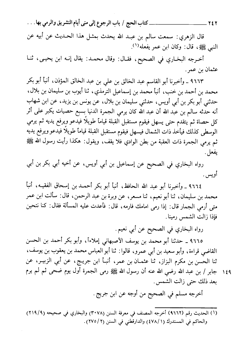 9665 - حَدَّثَنَا أَبُو مُحَمَّدِ بْنُ يُوسُفَ الْأَصْبَهَانِيُّ إمْلَاءً , وَأَبُو بَكْرٍ أَحْمَدُ بْنُ الْحَسَنِ الْقَاضِي قِرَاءَةً وَأَبُو سَعِيدِ بْنُ أَبِي عَمْرٍو , قَالُوا: ثنا أَبُو الْعَبَّاسِ مُحَمَّدُ بْنُ يَعْقُوبَ بْنِ يُوسُفَ , ثنا الْحَسَنُ بْنُ مُكْرَمٍ الْبَزَّازُ , ثنا عُثْمَانُ بْنُ عُمَرَ , أنبأ ابْنُ جُرَيْجٍ , عَنْ أَبِي الزُّبَيْرِ , عَنْ جَابِرِ بْنِ عَبْدِ اللهِ رَضِيَ اللهُ عَنْهُ أَنَّ رَسُولَ اللهِ صَلَّى اللهُ عَلَيْهِ وَسَلَّمَ §رَمَى الْجَمْرَةَ أَوَّلَ يَوْمٍ ضُحًى , ثُمَّ لَمْ يَرِمْ بَعْدَ ذَلِكَ حَتَّى زَالَتِ الشَّمْسُ , أَخْرَجَهُ مُسْلِمٌ فِي الصَّحِيحِ مِنْ أَوْجُهٍ عَنِ ابْنِ جُرَيْجٍ