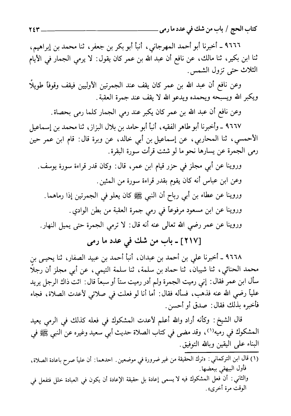 9668 - أَخْبَرَنَا عَلِيُّ بْنُ أَحْمَدَ بْنِ عَبْدَانَ , أنبأ أَحْمَدُ بْنُ عُبَيْدٍ الصَّفَّارُ , ثنا يَحْيَى بْنُ مُحَمَّدٍ الْحِنَّائِيُّ , ثنا شَيْبَانُ , ثنا حَمَّادُ بْنُ سَلَمَةَ , ثنا سُلَيْمَانُ التَّيْمِيُّ , عَنْ أَبِي مِجْلَزٍ أَنَّ رَجُلًا سَأَلَ ابْنَ عُمَرَ فَقَالَ: §إِنِّي رَمَيْتُ الْجَمْرَةَ وَلَمْ أَدْرِ رَمَيْتُ سِتًّا أَوْ سَبْعًا , قَالَ: ائْتِ ذَاكَ الرَّجُلَ يُرِيدُ عَلِيًّا رَضِيَ اللهُ عَنْهُ فَذَهَبَ فَسَأَلَهُ , فَقَالَ: أَمَّا أَنَا لَوْ فَعَلْتُ فِي صَلَاتِي لَأَعَدْتُ الصَّلَاةَ فَجَاءَ فَأَخْبَرَهُ بِذَلِكَ , فَقَالَ: صَدَقَ أَبُو الْحَسَنِ، قَالَ الشَّيْخُ: وَكَأَنَّهُ أَرَادَ وَاللهُ أَعْلَمُ لَأَعَدْتُ الْمَشْكُوكَ فِي فِعْلِهِ كَذَلِكَ فِي الرَّمْيِ يُعِيدُ الْمَشْكُوكَ فِي رَمْيِهِ وَقَدْ مَضَى فِي كِتَابِ الصَّلَاةِ حَدِيثُ أَبِي سَعِيدٍ وَغَيْرِهِ , عَنِ النَّبِيِّ صَلَّى اللهُ عَلَيْهِ وَسَلَّمَ فِي الْبِنَاءِ عَلَى الْيَقِينِ , وَبِاللهُ التَّوْفِيقُ