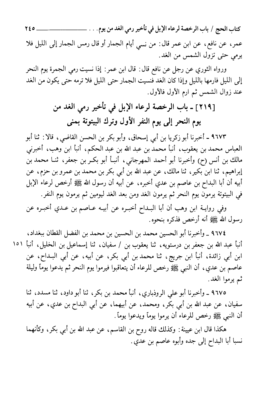 9673 - أَخْبَرَنَا أَبُو زَكَرِيَّا بْنُ أَبِي إِسْحَاقَ , وَأَبُو بَكْرِ بْنُ الْحَسَنِ الْقَاضِي قَالَا: ثنا أَبُو الْعَبَّاسِ مُحَمَّدُ بْنُ يَعْقُوبَ , أنبأ مُحَمَّدُ بْنُ عَبْدِ اللهِ بْنِ عَبْدِ الْحَكَمِ , أنبأ ابْنُ وَهْبٍ , أَخْبَرَنِي مَالِكُ بْنُ أَنَسٍ , ح وَأَخْبَرَنَا أَبُو أَحْمَدَ الْمِهْرَجَانِيُّ , أنبأ أَبُو بَكْرِ بْنُ جَعْفَرٍ , ثنا مُحَمَّدُ بْنُ إِبْرَاهِيمَ , ثنا ابْنُ بُكَيْرٍ , ثنا مَالِكٌ , عَنْ عَبْدِ اللهِ بْنِ أَبِي بَكْرِ بْنِ مُحَمَّدِ بْنِ عَمْرِو بْنِ حَزْمٍ , عَنْ أَبِيهِ أَنَّ أَبَا الْبَدَّاحِ بْنَ عَاصِمِ بْنِ عَدِيٍّ أَخْبَرَهُ , عَنْ أَبِيهِ " أَنَّ رَسُولَ اللهِ صَلَّى اللهُ عَلَيْهِ وَسَلَّمَ §أَرْخَصَ لِرِعَاءِ الْإِبِلِ فِي الْبَيْتُوتَةِ يَرْمُونَ يَوْمَ النَّحْرِ , ثُمَّ يَرْمُونَ الْغَدَ وَمِنْ بَعْدِ الْغَدِ لِيَوْمَيْنِ , ثُمَّ يَرْمُونَ يَوْمَ النَّفْرِ " وَفِي رِوَايَةِ ابْنِ وَهْبٍ " أَنَّ أَبَا الْبَدَّاحِ أَخْبَرَهُ عَنْ أَبِيهِ عَاصِمِ بْنِ عَدِيٍّ , أَخْبَرَهُ عَنْ رَسُولِ اللهِ صَلَّى اللهُ عَلَيْهِ وَسَلَّمَ أَنَّهُ أَرْخَصَ " فَذَكَرَهُ بِنَحْوِهِ