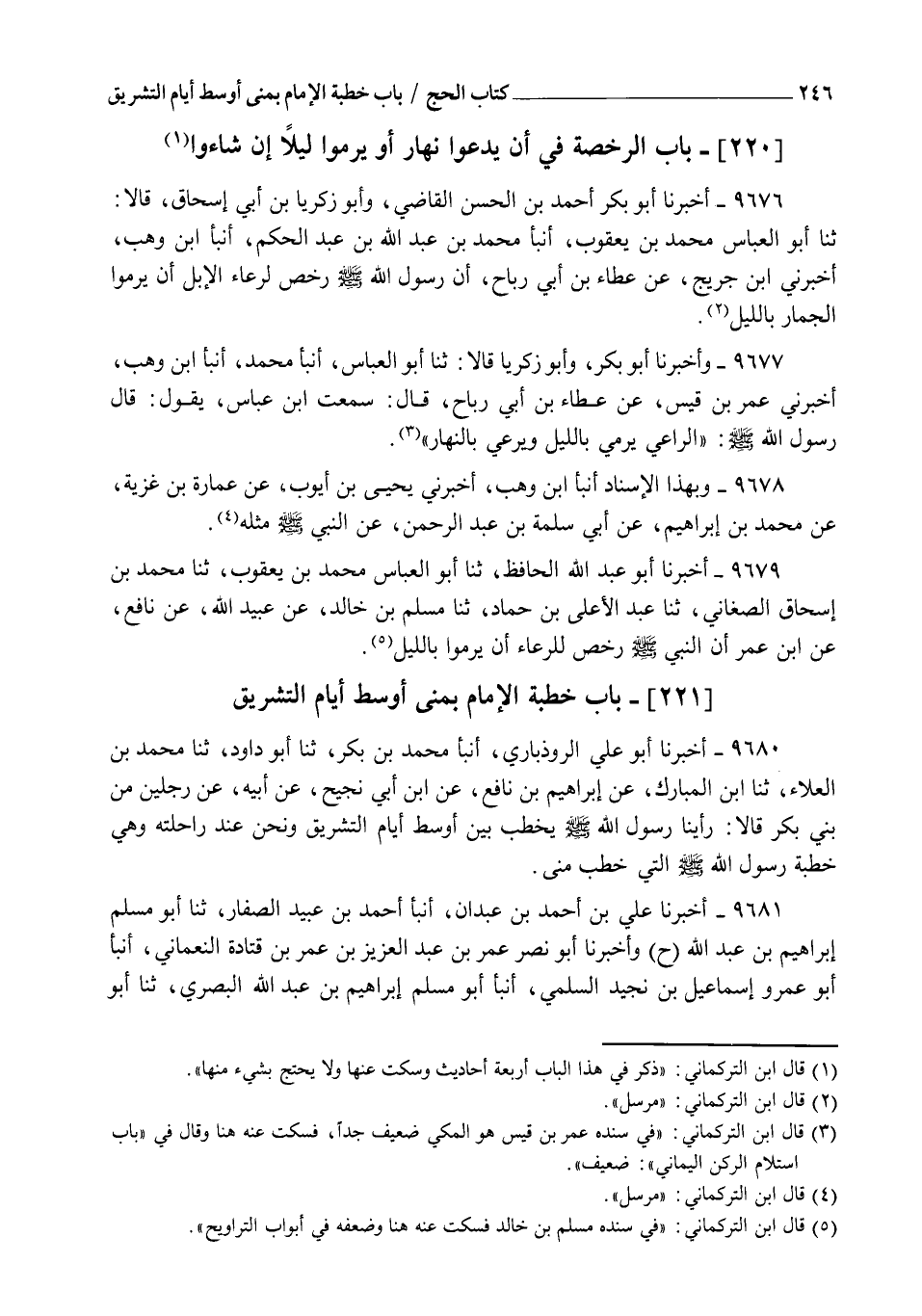 9680 - أَخْبَرَنَا أَبُو عَلِيٍّ الرُّوذْبَارِيُّ , أنبأ مُحَمَّدُ بْنُ بَكْرٍ , ثنا أَبُو دَاوُدَ , ثنا مُحَمَّدُ بْنُ الْعَلَاءِ , ثنا ابْنُ الْمُبَارَكِ , عَنْ إِبْرَاهِيمَ بْنِ نَافِعٍ , عَنِ ابْنِ أَبِي نَجِيحٍ , عَنْ أَبِيهِ , عَنْ رَجُلَيْنِ مِنْ بَنِي بَكْرٍ قَالَا: " رَأَيْنَا رَسُولَ اللهِ صَلَّى اللهُ عَلَيْهِ وَسَلَّمَ §يَخْطُبُ بَيْنَ أَوْسَطِ أَيَّامِ التَّشْرِيقِ وَنَحْنُ عِنْدَ رَاحِلَتِهِ وَهِيَ خُطْبَةُ رَسُولِ اللهِ صَلَّى اللهُ عَلَيْهِ وَسَلَّمَ الَّتِي خَطَبَ مِنًى "