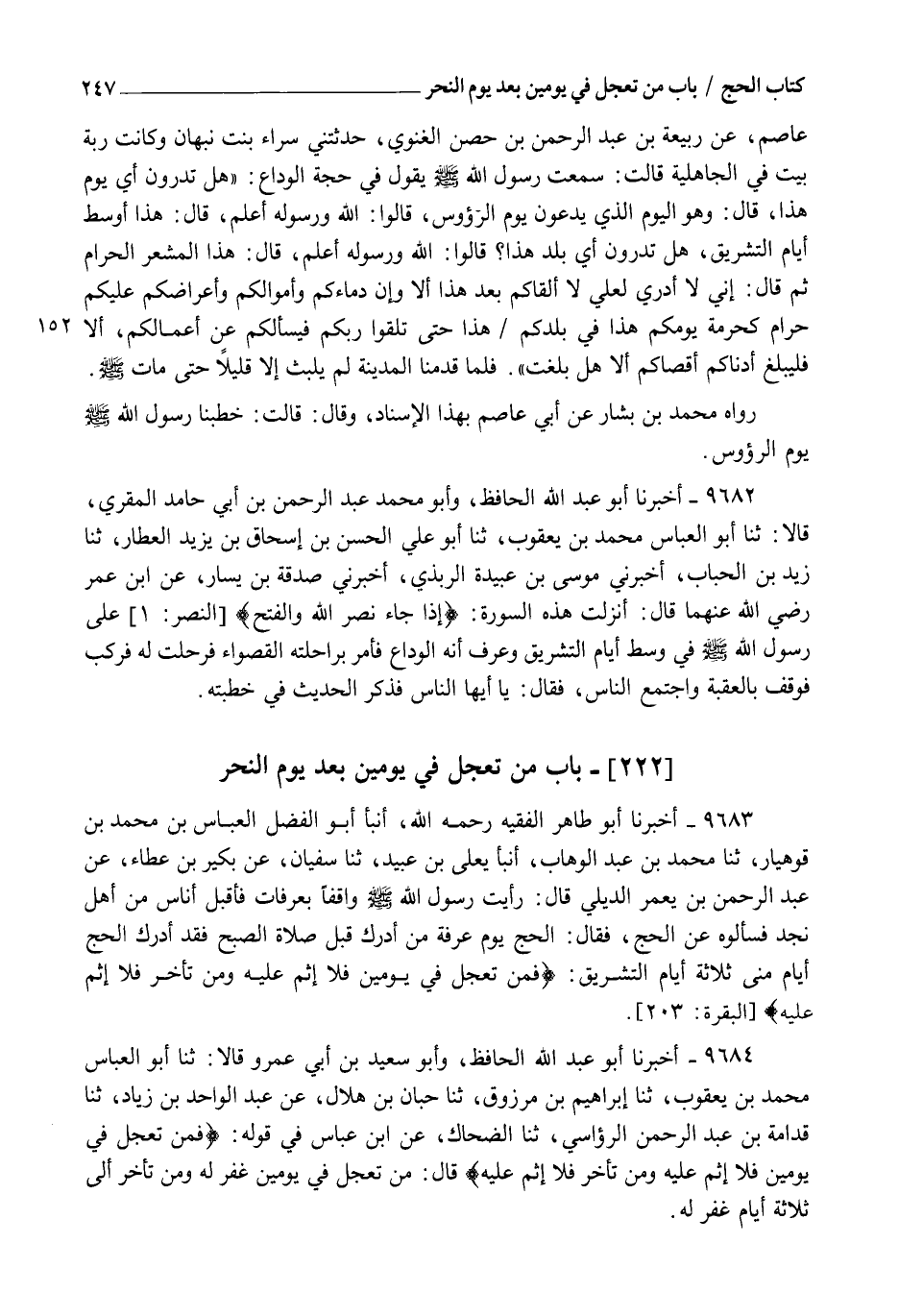 9683 - أَخْبَرَنَا أَبُو طَاهِرٍ الْفَقِيهُ رَحِمَهُ اللهُ , أنبأ أَبُو الْفَضْلِ الْعَبَّاسُ بْنُ مُحَمَّدِ بْنِ قُوهِيَارَ , ثنا مُحَمَّدُ بْنُ عَبْدِ الْوَهَّابِ , أنبأ يَعْلَى بْنُ عُبَيْدٍ , ثنا سُفْيَانُ , عَنْ بُكَيْرِ بْنِ عَطَاءٍ , عَنْ عَبْدِ الرَّحْمَنِ بْنِ يَعْمَرَ الدِّيلِيِّ , قَالَ: رَأَيْتُ رَسُولَ اللهِ صَلَّى اللهُ عَلَيْهِ وَسَلَّمَ وَاقِفًا بِعَرَفَاتٍ فَأَقْبَلَ أُنَاسٌ مِنْ أَهْلِ نَجْدٍ فَسَأَلُوهُ عَنِ الْحَجِّ , فَقَالَ: §" الْحَجُّ يَوْمُ عَرَفَةَ مَنْ أَدْرَكَ قَبْلَ صَلَاةِ الصُّبْحِ فَقَدْ أَدْرَكَ الْحَجَّ , أَيَّامُ مِنًى ثَلَاثَةُ أَيَّامِ التَّشْرِيقِ {فَمَنْ تَعَجَّلَ فِي يَوْمَيْنِ فَلَا إِثْمَ} [البقرة: 203] عَلَيْهِ وَمَنْ تَأَخَّرَ فَلَا إِثْمَ عَلَيْهِ "