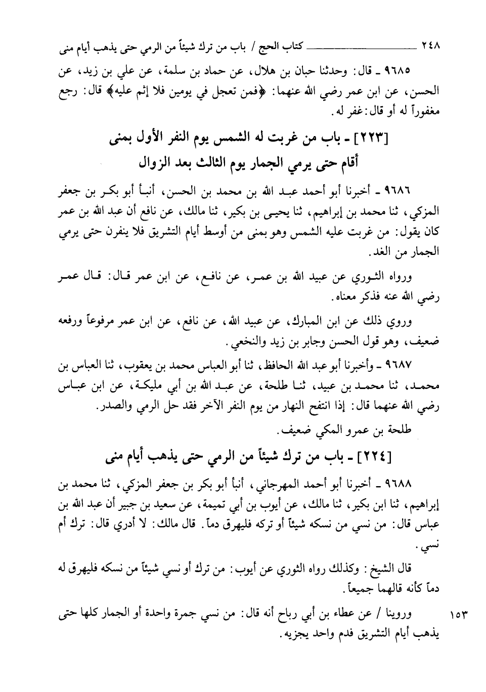 9686 - أَخْبَرَنَا أَبُو أَحْمَدَ عَبْدُ اللهِ بْنُ مُحَمَّدِ بْنِ الْحَسَنِ , أنبأ أَبُو بَكْرِ بْنُ جَعْفَرٍ الْمُزَكِّي , ثنا مُحَمَّدُ بْنُ إِبْرَاهِيمَ , ثنا يَحْيَى بْنُ بُكَيْرٍ , ثنا مَالِكٌ , عَنْ نَافِعٍ أَنَّ عَبْدَ اللهِ بْنَ عُمَرَ , كَانَ يَقُولُ: §" مَنْ غَرَبَتْ عَلَيْهِ الشَّمْسُ وَهُوَ بِمِنًى مِنْ أَوْسَطِ أَيَّامِ التَّشْرِيقِ فَلَا يَنْفِرَنَّ حَتَّى يَرْمِيَ الْجِمَارَ مِنَ الْغَدِ " وَرَوَاهُ الثَّوْرِيُّ , عَنْ عُبَيْدِ اللهِ بْنِ عُمَرَ , عَنْ نَافِعٍ , عَنِ ابْنِ عُمَرَ , قَالَ: قَالَ عُمَرُ رَضِيَ اللهُ عَنْهُ فَذَكَرَ مَعْنَاهُ , وَرُوِيَ ذَلِكَ عَنِ ابْنِ الْمُبَارَكِ , عَنْ عُبَيْدِ اللهِ , عَنْ نَافِعٍ , عَنِ ابْنِ عُمَرَ مَرْفُوعًا , وَرَفْعُهُ ضَعِيفٌ وَهُوَ قَوْلُ الْحَسَنِ , وَجَابِرِ بْنِ زَيْدٍ , وَالنَّخَعِيِّ